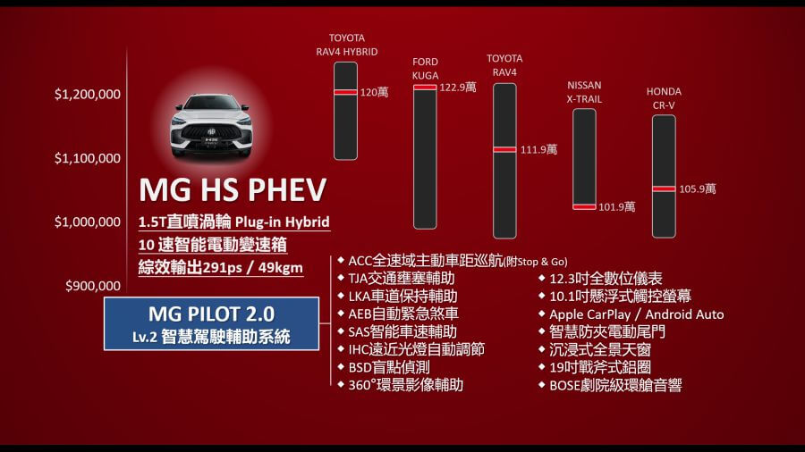 MG Taiwan看準持續成長的休旅車市場,以及低排量大馬力與新能源之市場潮流,在今日首度亮相在台第一款新車-當家跑格休旅HS車系,以高性價比和出眾的配備水準為訴求,分別推出百萬內超值首選「HS 1.5T」,以及國產唯一PHEV插電式混合動力「HS PHEV」兩種動力編成車款。內裝部份,藉由雙前座電動一體式賽車椅,營造出駕駛艙性能操駕氛圍,並以2720mm長軸距優勢,賦予每位乘客寬敞舒適的乘坐空間。另外,HS 1.5T、HS PHEV搭載12.3吋數位儀表與10.1吋懸浮式觸控螢幕,並內含Apple CarPlay® 及 Android Auto™功能,所有資訊直覺整合,提供饒富娛樂性的數位化使用體驗。