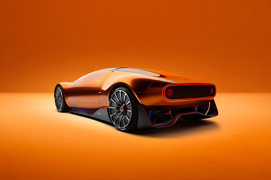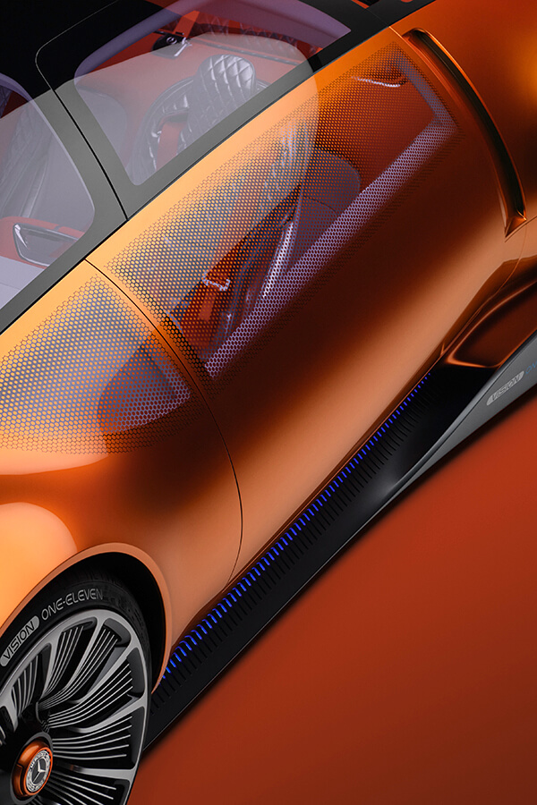 老司機此時已經知道Vision One-11的靈感其實來自它們過去自家的C111概念車,Mercedes在當年的C111上考慮試驗轉子引擎、柴油引擎及渦輪引擎,並將空力概念融入由玻璃纖維打造的車身當中,現在Vision One-11則是在每具車輪後安排了YASA 軸向磁通電機與一個堅固的電池組。同時低矮的橙色車體採用曾運用在EQXX及F 015的”one-bow”設計。在與車頂幾乎形成同一平面的車身上有巨型的鷗翼車門,平滑軀體的下緣附帶有一些大型空力套件。雖然大家都喜歡的上掀式頭燈很遺憾地未能重現,但車輛頭尾的像素化LED燈則賦予Vision One-11更前衛的面貌―你甚至可以坐在車內向周遭進行溝通,比如說”關掉你的遠燈”之類的…。