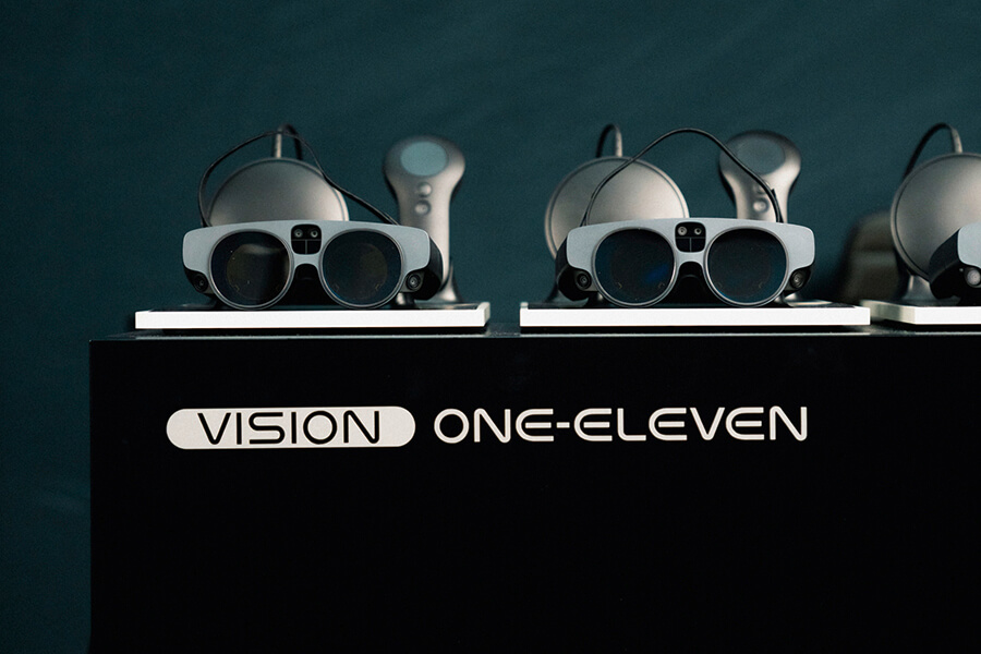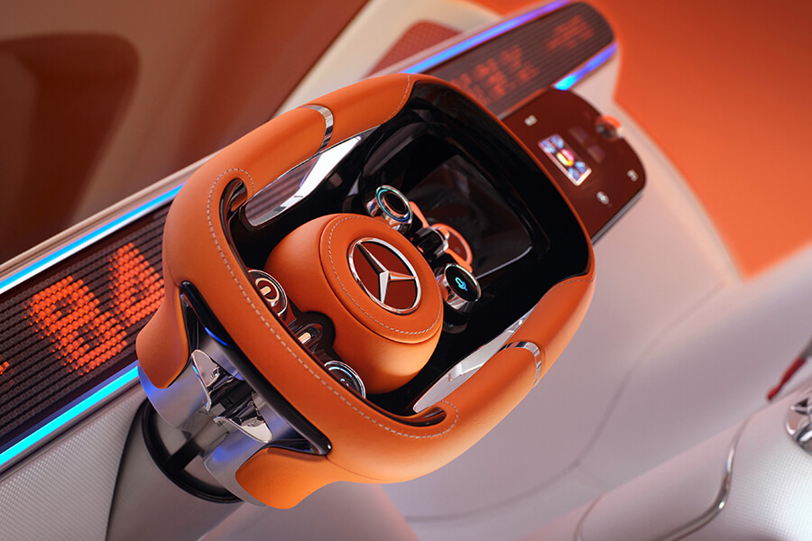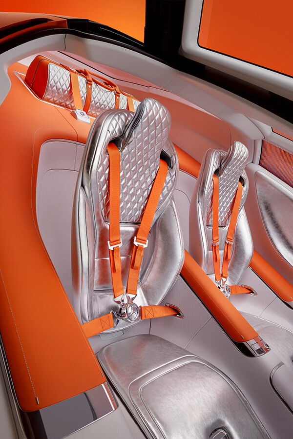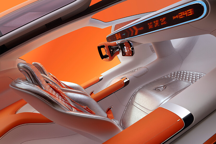 車內鋪陳據稱混搭了60-90年代的科幻元素,由100%再生聚酯製成的織物材質儀表,相搭配的亮橙色皮革採用咖啡豆殼進行永續性鞣製,在兩張配有亮橘四點式安全帶、坐姿好似F1的座椅後頭,後擋風玻璃正下方的區域則為後行李架,內有一只大行李包,一樣由亮橘綁帶固定住。呈現極簡風格的車室內,唯一複雜的東西大概只有那具真皮方向盤了。再拋光鋁材輻條間整合各種控制按鈕與觸控件,一旁的螢幕微微朝向駕駛側,負責顯示所有車輛相關訊息。所有?其實不是,在Vision One-11上Mercedes還為其增加了AR增強實境功能,只要戴上Magic Leap 2 AR眼鏡,就可以看到車內各處所呈現的資訊,讓整輛車都成為使用者的操控介面。更加實際一點來說,除了展示一些3D圖標與導航之外,甚至可以為你呈現道路前方視覺死角外的道路工程、顯示被A柱、車門甚至後方的引擎蓋…所有阻擋駕駛視線的物品都會在AR投影中變得透明。