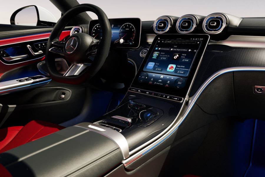 其他項目如新一代MBUX多媒體系統,採用5G通訊模組,可透過第三方應用程式如影音平台「YouTube」觀賞影片,或透過「Teams」及「Zoom」進行線上會議,不僅如此,還有「例行程序Routines」,譬如下午六點下班從辦公室離開,系統會自動開啟導航前往健身房,並開啟對應的行車模式與燈光,搭配 Burmester ® 3D 環場音響系統,播放身歷其境的 Dolby Atmos ® 全景聲的樂曲,滿足您對生活的期待。