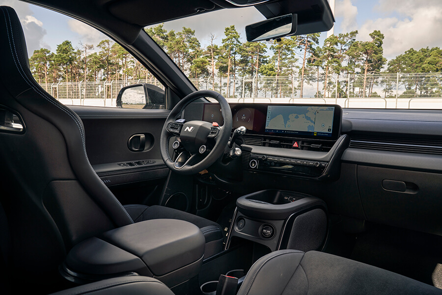 不過這部Ioniq 5之所以是N版本,最大原因還是現代出盡他們的電子法寶務使此車不單速度凌厲,舞起來還得新奇有趣令人神往。你可以潛入功能選單深處改東改西令它發出活靈活現的引擎聲浪,響似噴射戰鬥機或激光劍破風聲也可。說來奇怪,這個回合中最悅耳的人造引擎聲浪,居然就是來自Ioniq 5 N,原因很大程度上與另一個駕駛模式——N e-Shift——有關。這個模式內建標標準準的一個八速方向盤換檔虛擬變速箱,能夠做到機械式變速箱所做的事,譬如維繫扭力好讓你直搗幻想中的8,000rpm天花板時感到加速力持續上升,然後好似車手因為忘記一拉撥片升檔而啟動限轉器一樣突然鳴金收兵打斷扭力寸勁,升檔時曉得輕輕踢你屁股一腳,降檔又會交足補一腳油大戲,而且人造聲浪能夠即時反映油門位置、引擎轉速和當前所用「檔位」。這一切好似人工化到駭人聽聞,實際效果卻非常精彩,十分自然,自然到令人渾忘自己正在打交道的對象並非引擎和齒輪,而是電腦程式。個人最高評價?在Gotlandring痛快跑一圈,用e-Shift其實更過癮。