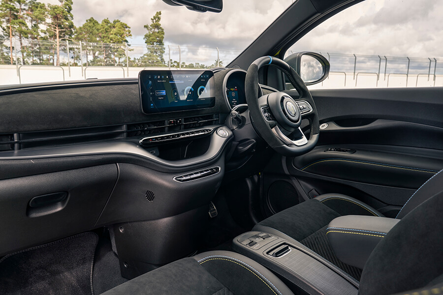 Abarth 500e卻與之南轅北轍,總之一有機會便會搧你兩巴掌取注意令你忍不住眉開眼笑。我並不討厭這身鮮亮車漆和車身配件,甚至不介意那套為人津津樂道的花招——在後保桿下方裝喇叭配合油門動作播放百分百人造的引擎聲浪(聲浪起伏與油門動作有明顯時間差喔)。這部飛雅特傻裡傻氣,卻勝在傻得可愛。它並非格外講究性能,馬力畢竟只有152hp,0-100km/h說到底也要花上七秒,卻不啻一個高呼「我有好多搞熱派對氣氛的把戲呢,各位可別看走眼」的聲明。
