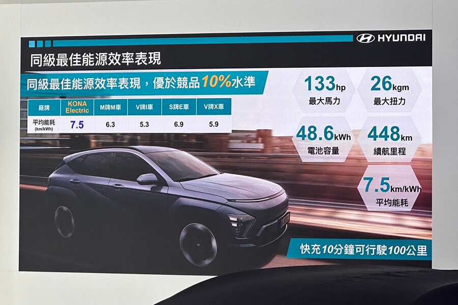 全新大改款KONA Electric以其大小適中的車身尺碼、高品質高剛性的造車工藝、次世代參數化外觀設計等全新技術和便利功能,提供消費者安全舒適的駕駛體驗。KONA Electric打破傳統由內燃機到電動車的開發過程,改以電動車為中心「EV-first」設計理念,整體充分展現未來主義。大改款KONA採用獨特設計語彙,使用參數化元素增添未來感, Pixels 無縫地平線LED日行燈和尾燈增添了獨特的魅力,亮眼的外觀顏色進一步強調了 KONA 的次世代未來感設計。動力上以前置的永磁同步馬達搭配48.6kWh液冷鋰離子聚合物電池,具有133hp、26kgm最大動力表現,極速可達162km/h;具有448公里的NEDC續航里程測試值,充電規格則為交流電SAE J1772、直流CCS1,7.5km/kWh的每千瓦時里程表現則是其出眾之處,Hyundai亦表示KONA Electric在經過快充10分鐘過後,就足以增加100公里的續航能力。