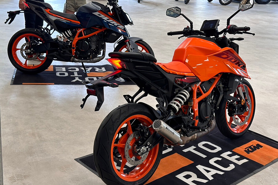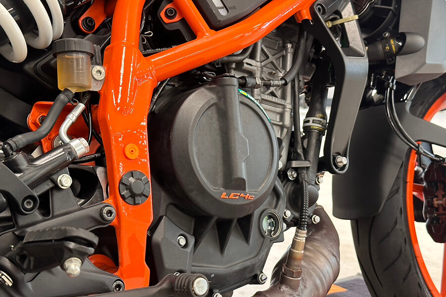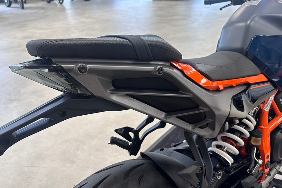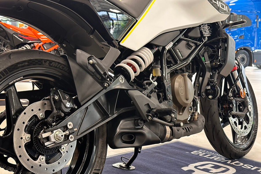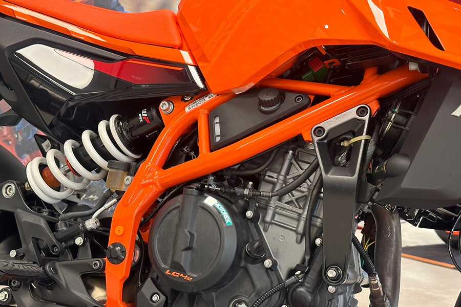 黑白雙箭與390 DUKE同樣用上這顆針對缸頭及變速箱進行改良的LC4c引擎、亦配有滑動式離合器,五段雙向阻尼可調的WP APEX前叉同側置、可調預載與回彈的後避震亦是相同配置。820mm座高亦是較前代降低15mm,坐墊本身的泡棉材質也似乎更軟了,乘坐起來的舒適度明顯更好。13L油箱兩側的大面積飾板也採取更大氣、同時也更好在騎乘間夾持的造型。