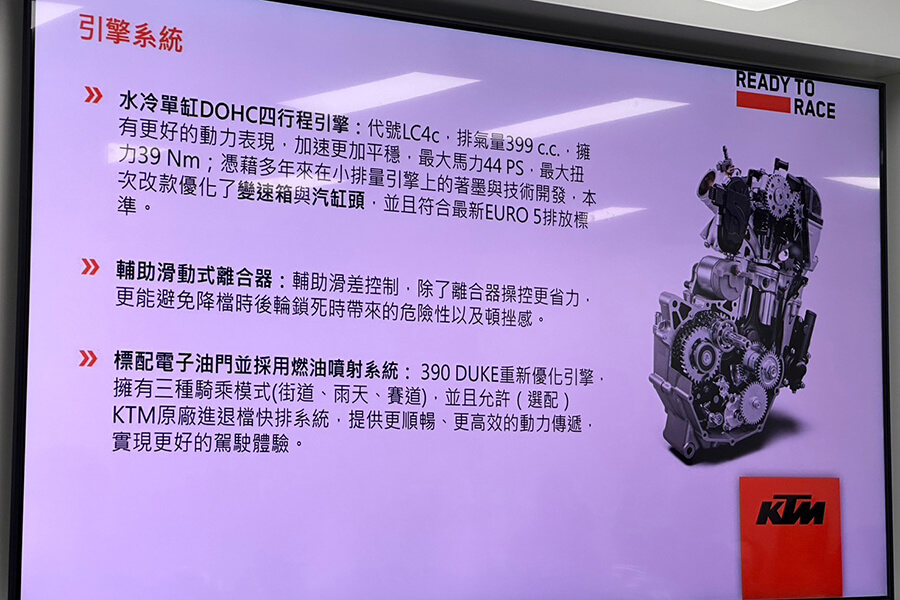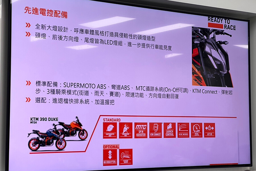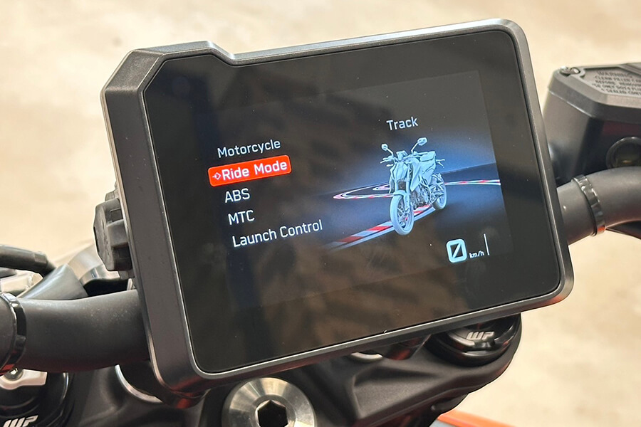 除了以上的變化之下,五吋TFT儀表的畫質、圖像、辨識度與設計質感更是大幅提升,可自動調整亮度、日夜間模式、檔顯以及單圈速度,使用起來的清晰邏輯卻與過去你所熟悉的任何一部KTM完全相同。在延續既有的電子油門設定下,這次390 DUKE在維持Supermoto ABS、MTC循跡系統以及KTM Connect手機藍芽多媒體連線功能之外,更多了彎道ABS、彈射起步、分為街道、雨天及賽道三種騎乘模式、方向當自動回復以及限速功能等。
