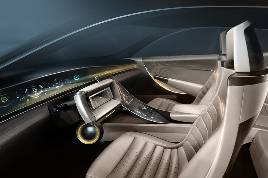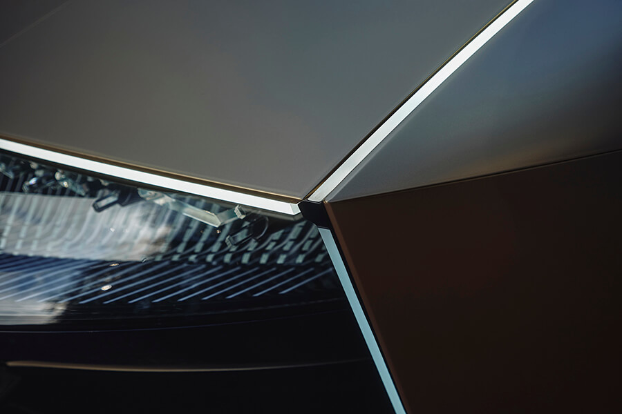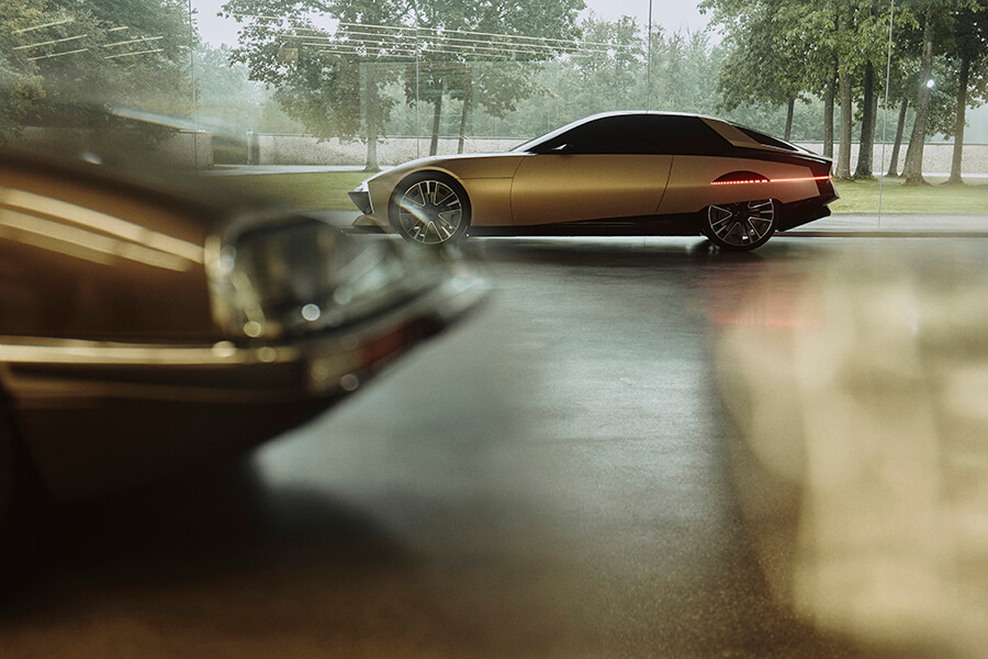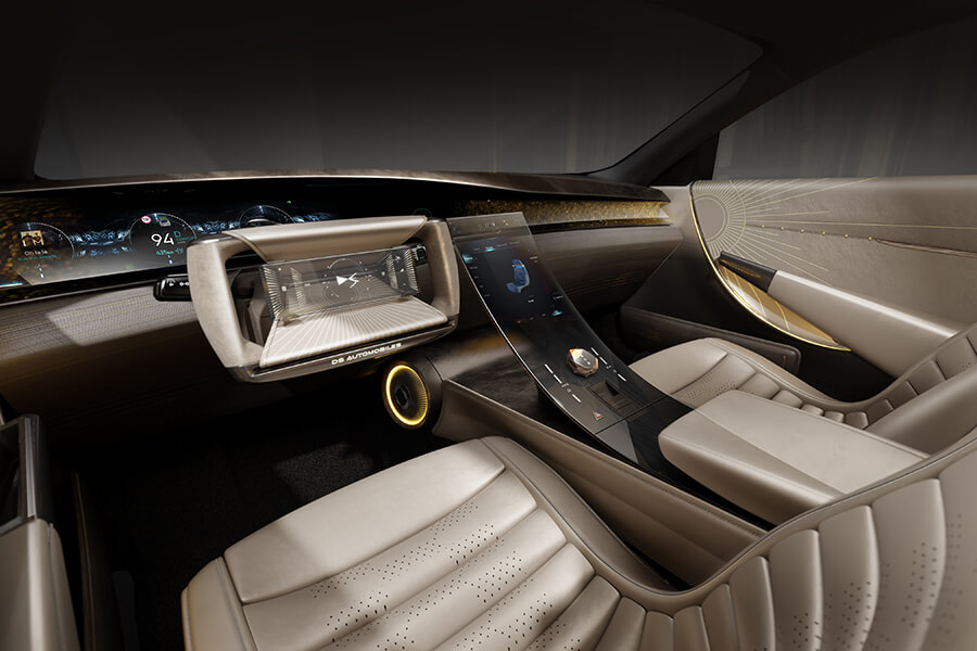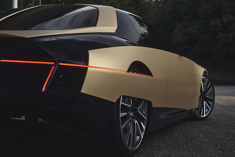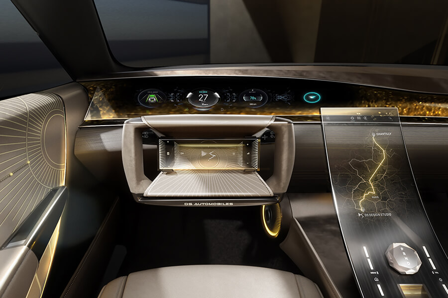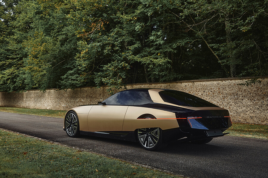 交代過脈絡之後,讓我們將焦點回到這輛最新的概念車吧:DS Tribute的出現除了致敬老前輩、也在此預示了DS品牌的未來風貌。因此你能在熟悉的橫貫式前燈周圍發現細長且有稜有角的日行燈、更加細長的後照鏡(也許已是數位後照鏡),半封閉式的後輪蓋也在輪胎上緣做出開孔,並讓尾燈線條一路延伸至輪拱前緣。整體身姿雖然維持當年的身型比例,不過在全然重新設計下,實際體型亦略有微幅增長。雙色調的外觀烤漆被稱為”Gold Leaf”(金葉),是將緞面清漆與銅綠混合而成、再搭配黑色的點綴,同時該配色也是當年出現在SM新車型路上的配色選項之一。車內以大面積曲面螢幕代替了舊款的成排按鍵與儀表,就連軛式方向盤上也放入了顯示螢幕。
