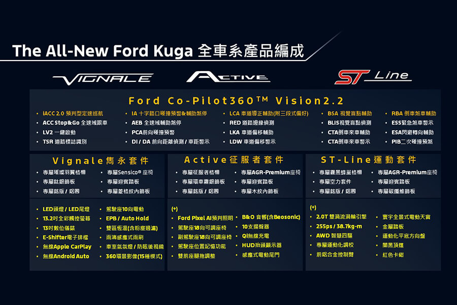The All-New Ford Kuga推出同級之最「Vignale/Active/ST-Line」三款專屬子品牌套件,並導入Ford最新安全科技Ford Co-Pilot360TM Vision 2.2 全方位智駕預判輔助系統、Ford Pixel AI預判型動態照明系統,對應全面升級的1.5T/2.0T EcoBoost® MPC模組化引擎及全新8速自排變速箱,讓The All-New Ford Kuga能在原有「歐系駕馭樂趣」、「領先智駕輔助科技」等產品優勢之上,以全方位之姿滿足台灣消費者對於中型休旅的各式要望。
