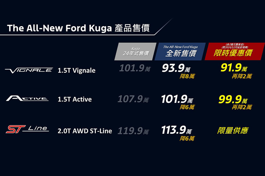 自2020年上市以來,第三代New Ford Kuga以「雙動力/三外觀」產品模式,持續於台灣中型休旅市場佔有一席之地。面對瞬息萬變的台灣市場態勢及越趨多元的消費者用車需求,福特六和以超越眾人預期,以最高標準持續自我要求,於今日(10/2)推出全新歐洲超能智駕跑旅The All-New Ford Kuga,指定車型於即日起至10/31入主享限時優惠價舊換新86.9萬元起,擁總價值最高達6萬元之尊榮6大豪禮:1萬配件金、2萬限時購車金、3萬元輕鬆開回家(或低月付9,990元起)入主方案,以及3年免費更新預判系統專用導航圖資(市值3萬元);本月入主再享限量Ford 酷涼隨行杯、試駕週週抽iPhone16 Pro 等超值優惠方案,讓消費者以更超值的方式,入主科技配置最頂尖的The All-New Ford Kuga。