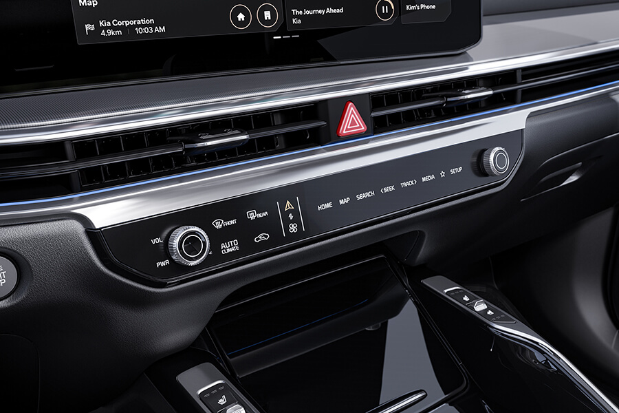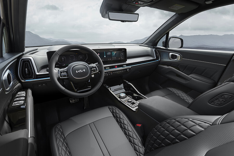 Sorento的全新科技座艙以雙12.3吋全景曲面顯示螢幕作為視覺焦點。一體式全景顯示螢幕不僅外觀優雅,支援Apple CarPlayTM / Android AutoTM,更以駕駛為中心、讓視野更加清晰無死角。搭配一鍵切換數位控制面板,不僅讓科技座艙更加簡潔俐落,更可輕鬆切換空調與音響操作介面。此外更導入指紋辨識系統,讓不同使用者可輕鬆切換駕駛喜好設定(Premium Plus選配套件限定)。其他包含Qi手機無線充電功能、10吋HUD抬頭顯示器(Premium Plus選配套件限定)、車內電子數位後視鏡(Premium Plus選配套件限定)等,打造出舒適便捷與科技質感兼具的行車享受。