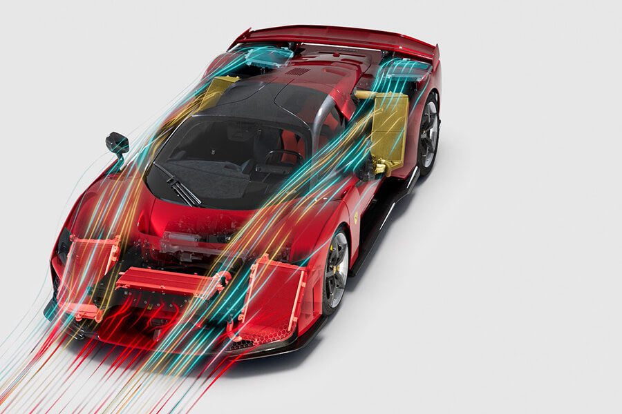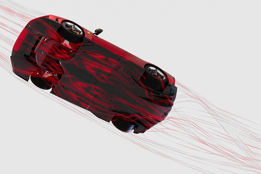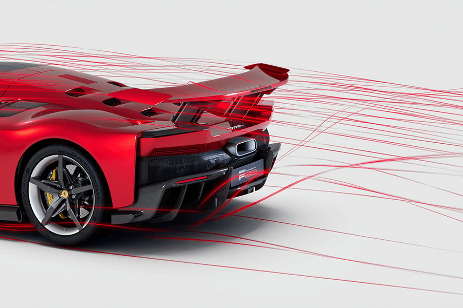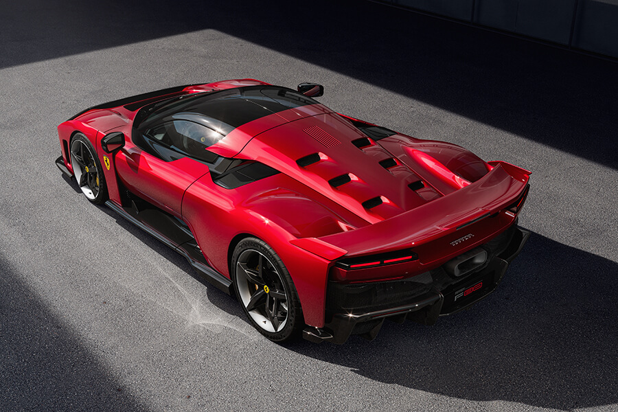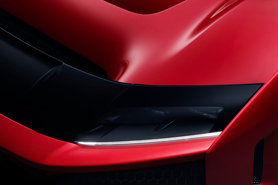 橫貫車頭的黑色面板與超大可動尾翼是你的菜嗎?即便不是,它的空力表現仍然無庸置疑。F80在時速250公里的狀態下具有足足一噸的下壓力,其中前端取汲自WEC的S-Duct設計、內部襟翼以及輪廓設計貢獻了460公斤;而在駕駛腳下的三對導流板也有助於將車底氣流外洗、同時有助於梳理接下來流向車尾的氣流。最後剩餘的590公斤下壓力是法拉利史上最長擴散器(1800mm)與大型尾翼分工合作下的成果,同時這具既可升降、又可前後傾斜的尾翼不僅能在煞車時前傾作為空氣煞車,更可在高速狀態下連續控制迎角、甚至向後傾斜以降低整體風阻,厲害吧。在此般空力性能下,車頭對於離地距變化的反應可說相當明顯,此時就有賴主動式懸吊及主動是空力系統做出相應的調配,使車輛維持一定的行駛高度。