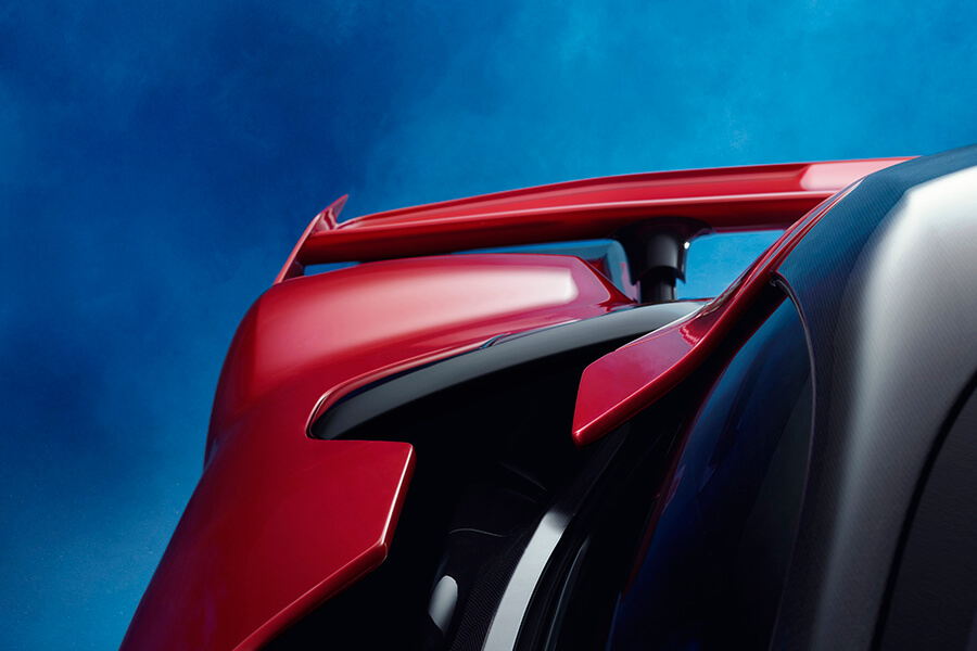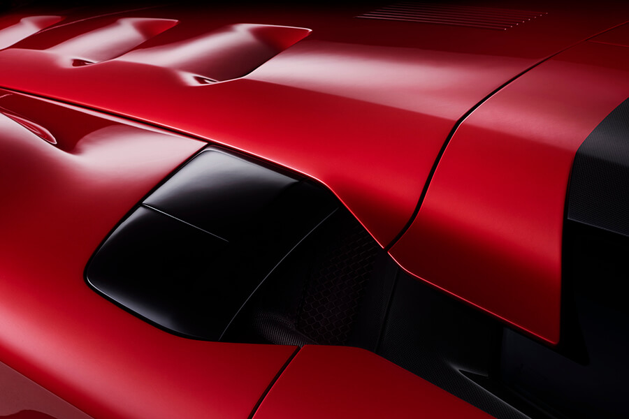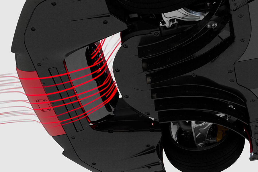 接下來要介紹的是”Impluvium”,就是俯視此車時兩側的大型NACA管道狀進氣口的名稱。這兩組Impluvium專為引擎及位在後輪拱前方的冷卻器提供冷空氣,作用與車頭燈下方兩處大型進氣口相同。當然,四具擺放在輪胎前方的冷排皆採高效率的迎角擺放。同時輪拱內的Brembo CCM-R Plus煞車系統亦能坐收冷卻之效。