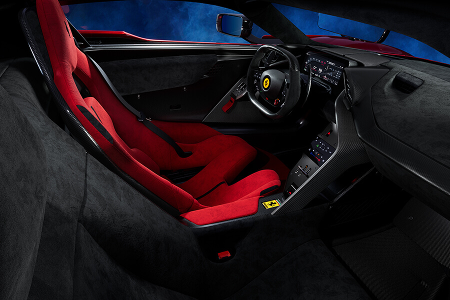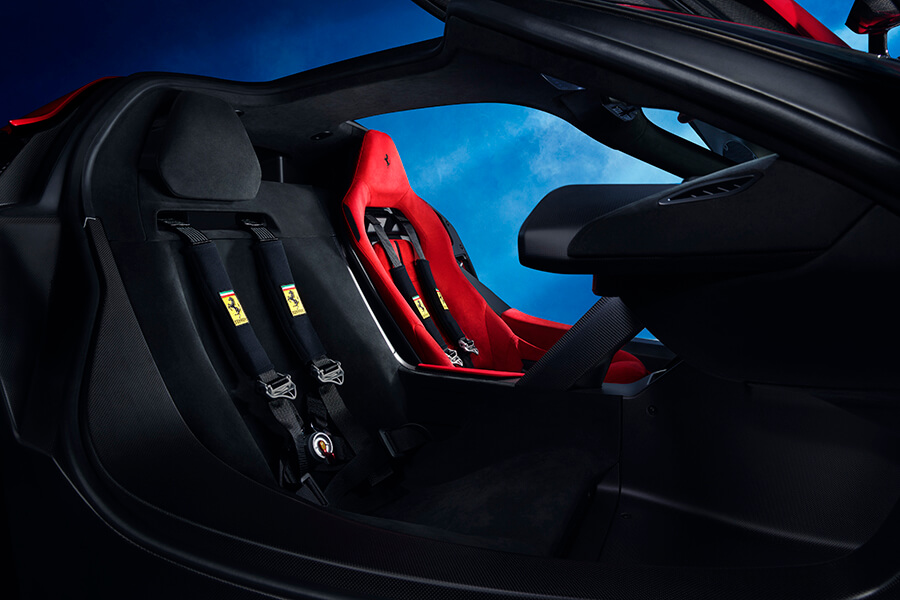 比起LaFerrari還要輕上5%、扭轉剛性提升50%(!)的碳纖維單體車艙採不對稱設計,略為靠後而使腿部擺放處微微抬起的設計使其能配合車底的整流設計;另外你還能在周圍看到由Multimatic設定的彈簧、阻尼、電機裝置及藉由3D列印製造、顯然經過拓樸學分析簡化結構的懸吊叉臂,其外才是法拉利史上首款五輻碳纖維輪圈,以及米其林 Pilot Sport Cup2 或 Pilot Sport Cup2Rs配胎。