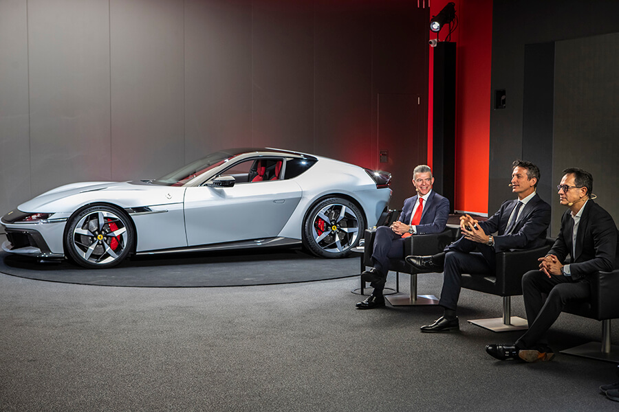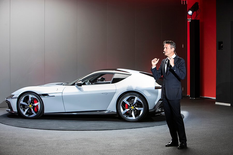 行銷總監Enrico Galliera心平氣和唸出一串大家都聽不懂的詞,他在說什麼?哦,原來是義大利文12Cilindri,就是新車的名字嗎?請注意,這個字將12與與Cilindri連在一起,也就是說法拉利創造了一個新字,而且希望大家用義大利文唸出來,這也表示所有人得開始試著唸出12Cilindri的正確發音,但這時產品簡報還在進行中,可不能分心啊,因為相機跟手機都被鎖在置物櫃裡,手上能用來記錄重點的只有鉛筆及記事本……。