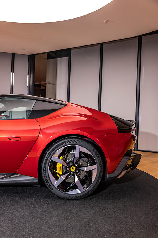 性能、舒適性和設計是這次12Cilindri的三大主軸,兼具性能及效能的V12動力配上鋁合金製作的輕量化車架造就出內涵豐富的座艙,加上人見人愛又性感的造型,12Cilindri就是帥的如此理直氣壯。當然,較敏感的朋友會從與前一代相似的機械架構與性能,問及12Cilindri與812 Superfast之間的關係,Gianmaria表示就製程與規格而言,底盤與機械架構是全新的,不過這取決於你用何種標準來看,如果就基礎設計而言,12Cilindri確實與812之間關係密切,不過因應車架剛性與抗扭曲能力強化,軸距甚至縮短20mm,整體重量雖因更豐富的配備讓體重微幅上揚至1,560kg,但與SF90 Stradale相較,12Cilindri的體重只相當於多帶一卡登機箱。這時如果各位有注意到前面提及軸距縮短20mm這件事,或許變動很少,但對於錙銖必較且每一款產品的平衡性已近乎完美的工程部門來說,這20mm可謂一大步,簡單說就是方向盤與車身的互動更直接、敏銳,輪胎的抓地力表現會更穩定,這些只是先天的機械優化,再結合後天的電控四輪轉向及動態穩定控制系統,讓駕駛樂趣又昇華到另一個層面。