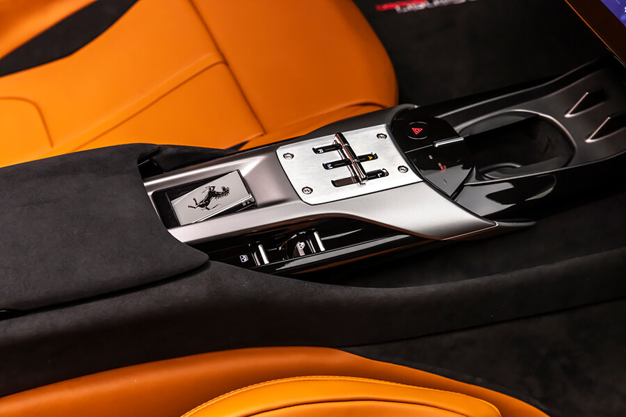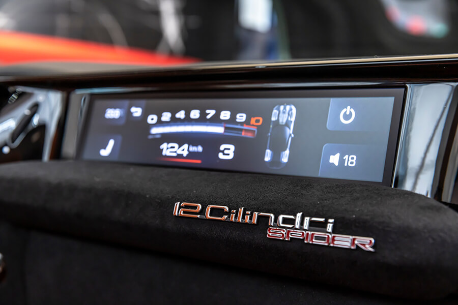 車艙與外形同樣耳目一新,雙獨立中控台是一大特點,駕駛座與乘客座各有自己的獨立區域,15.5吋的虛擬儀錶延續相同的設計邏輯,中央為引擎轉速,左側螢幕為性能及引擎相關資訊,左側螢幕則是導航、通訊及娛樂資訊,至於乘客座的8.8吋行車資訊螢幕,方向盤觸控板及Manettino駕駛模式選取包括按下為懸吊放軟一階功能,這些都是大家已相當熟悉的,反而是大家都習以為常的中央大螢幕才是新鮮貨,是的,這次多了一個10.25吋觸控螢幕,可與Apple CarPlay和Android Auto手機連線,這可是首次被雙座V12車型所採用,相信法拉利車主見到有此功能應該都會想放鞭炮以資慶賀……。法拉利過往較少涉足的高傳真音響,在這次亦特別找來Burmester合作,15個揚聲器的總功率高達1600瓦,作風雖迴異於法拉利本色,但用料和品質均屬上乘,誠可喜也。