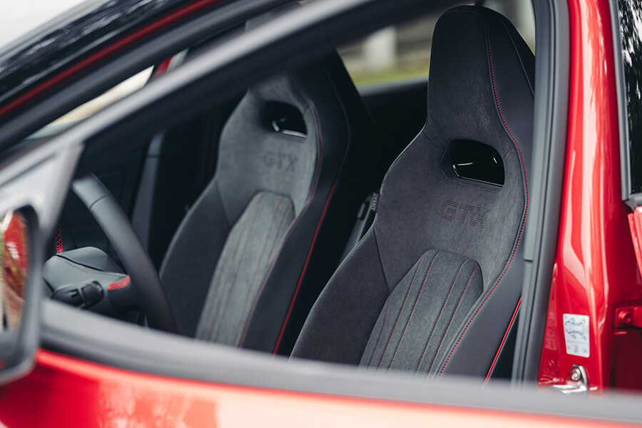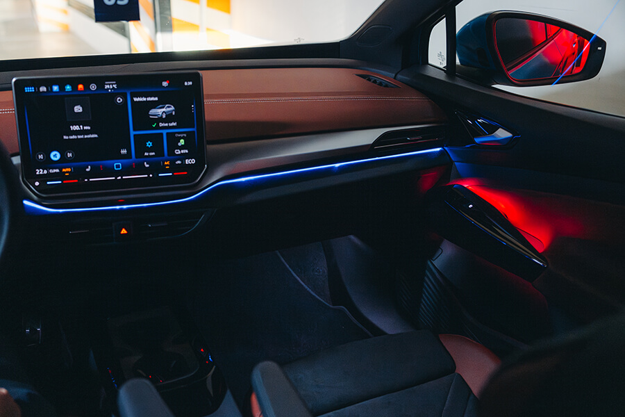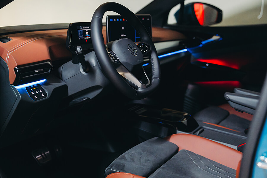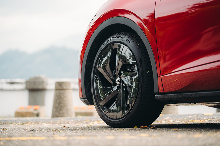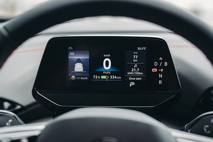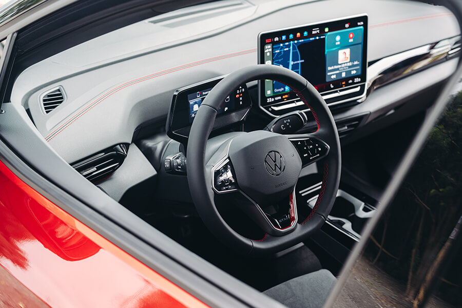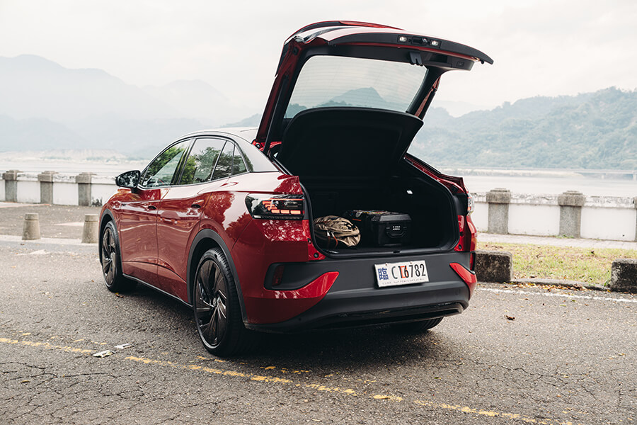 會拿到哪一台車?此刻我的手正在紙袋裡的鑰匙海里盲目翻攪,雖說同樣基於MEB平台的的ID.4與ID.5在外型、動力、續航與充電表現皆呈高度相關,不過畢竟是抽鑰匙嘛,總是沒來由地會有這種懸疑情緒油然而生。撿起一支鑰匙步出門外按下解鎖鍵,一輛艷紅的ID.5 GTX在不遠處亮了亮雙黃燈。嘿,其實在兩車型之中,ID.5圓滑的車頂線條、以及光滑銜接尾翼的設計本就搶先一步吸引我的目光,更不談其黑化的外觀套件、21吋鎗黑輪圈、後照鏡蓋與前氣壩的三點燈組綴飾,加上車內一以貫之的的紅黑鋪陳配上麂皮跑車座椅,你也知道TG總是偏好這一味嘛……。拉開半隱藏式門把、進入充滿空間感的車艙中,右手一擰進入D檔、腳尖輕點帶有播放圖案的電門踏板,與純電福斯的邂逅就這樣靜靜展開。