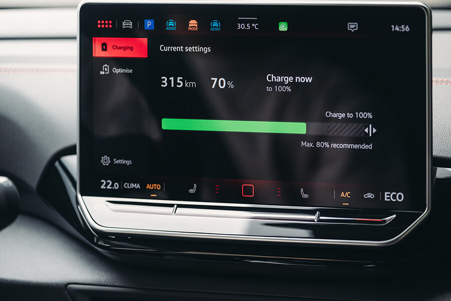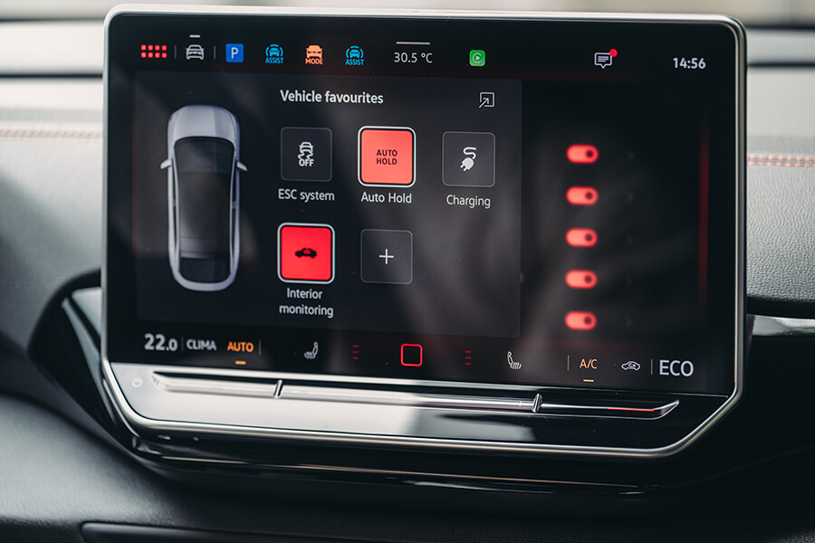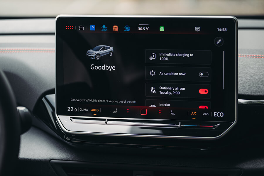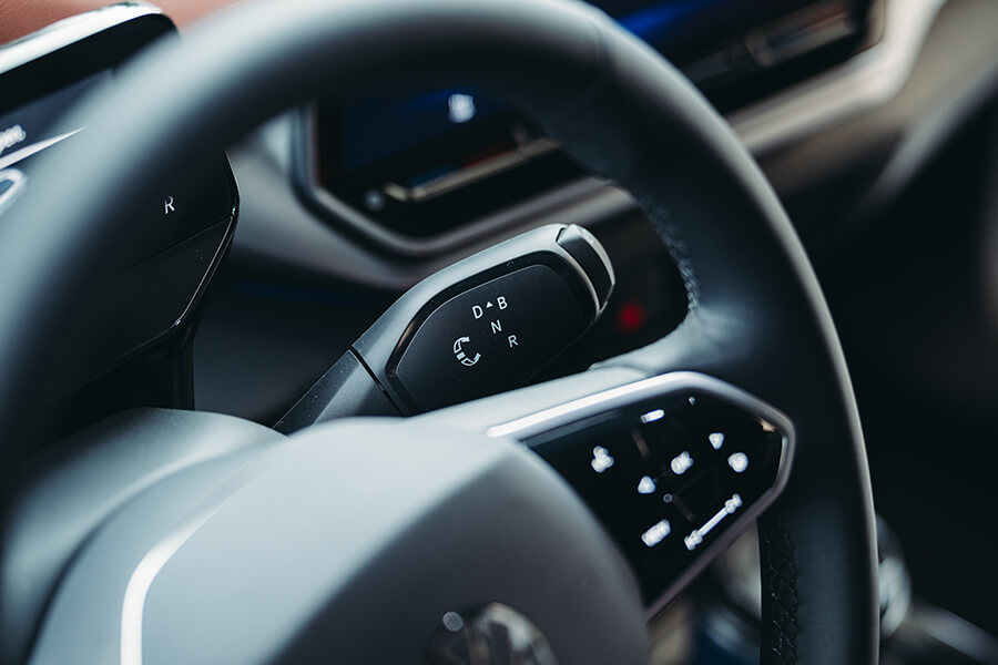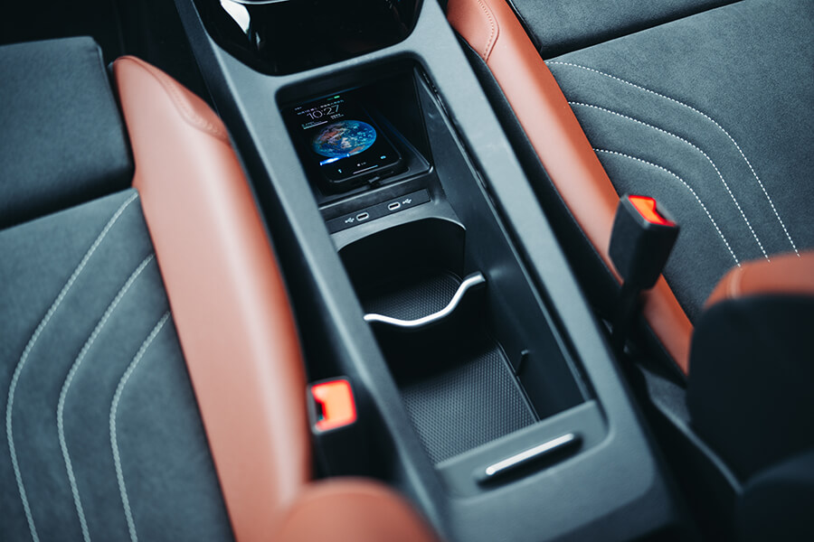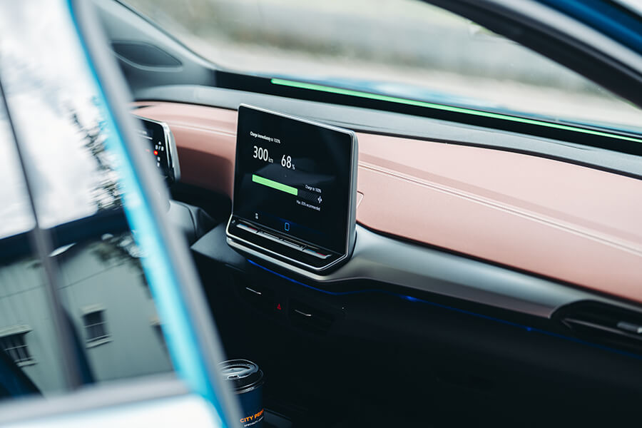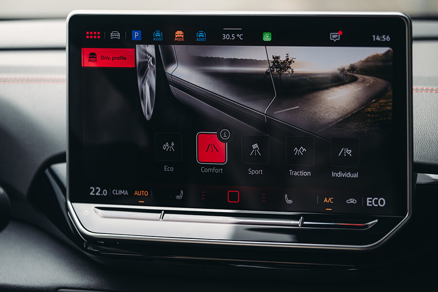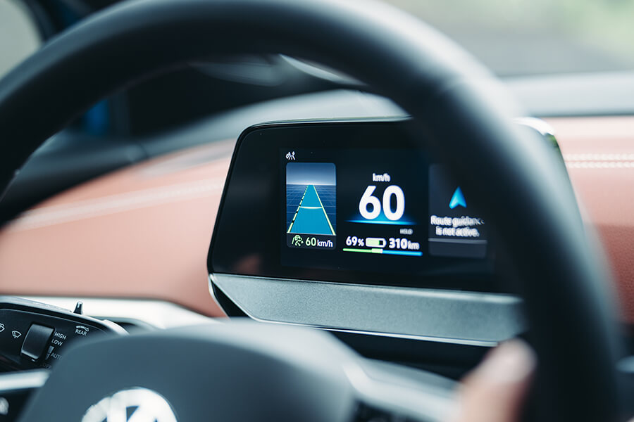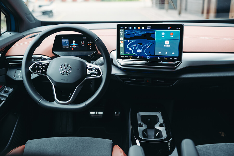 開著ID.4 Pro S上路後的第一印象,在呈現質感上並未與ID.5 GTX存在太大落差,反倒是這般內裝設計搭上灰棕雙色的鋪陳,又體現出一股令人放鬆舒坦的居家氛圍。眼看固定在方向機柱上的小型儀表中導航、輔助駕駛等功能仍然在列、中央螢幕依舊功能齊全,也就愉悅打開昨日頗有好評的前座按摩功能,開始第二天的路程。