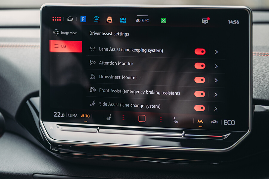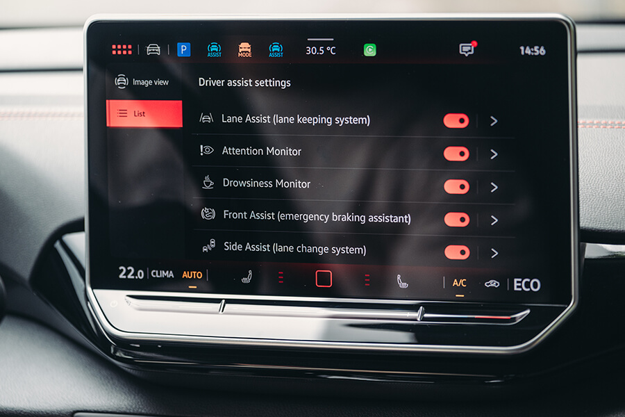 開著駕駛輔助很快就從市區來到濁水溪畔,球褲此時打算為此車內外拍下幾張照片,我也得閒藉機探索中央12.9吋的觸控螢幕。而這塊面板所呈現的內容也是我所操作過最為好用的介面之一……好吧,或許以Touch slider控制的空調還是不若傳統按鍵旋鈕那樣直覺,不過螢幕上緣一排的快速鍵可以讓我單憑一指抵達駕駛模式、車輛設定、停車輔助、CarPlay以及環景顯示等功能,操作從起心動念到完成動作,手指很少在螢幕上點擊超過兩下;而操作螢幕時的滑動與震動回饋更是靈敏精緻,簡直不能再好用,不過尚缺中文介面及OTA更新功能,有待未來VW向原廠進一步爭取。