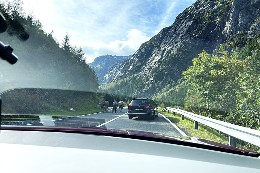 開著開著居然被幾位牧人攔下,接著傳來叮叮咚咚的聲音,看著幾頭牛兒愜意的走在馬路上,好不有趣啊。