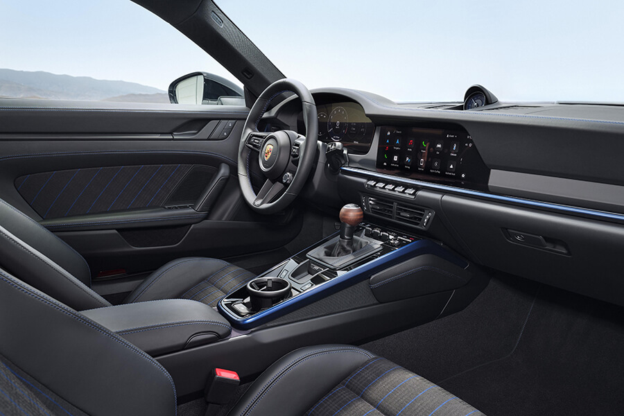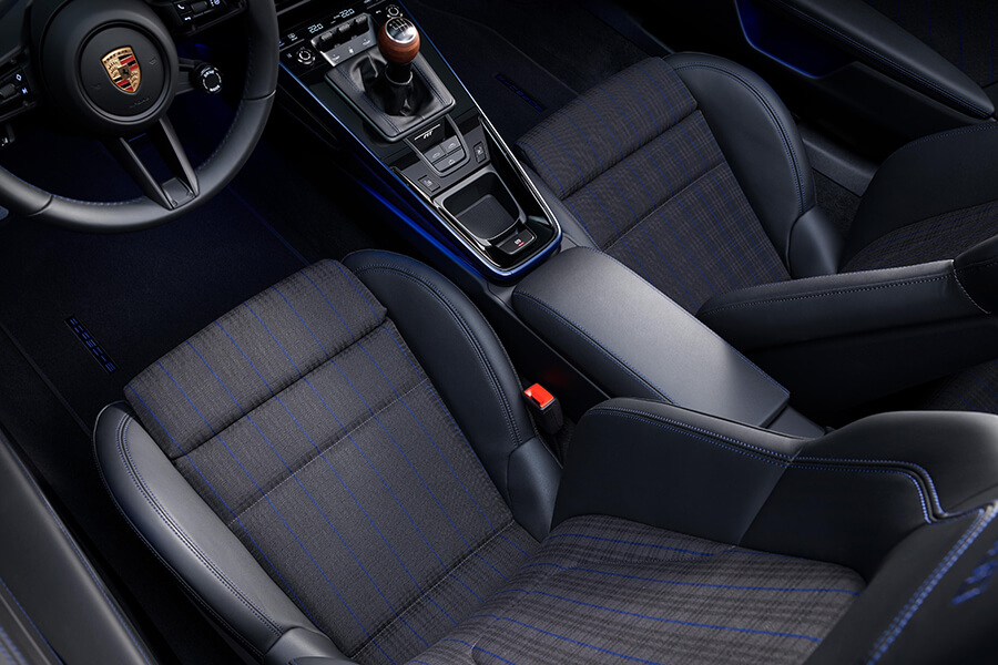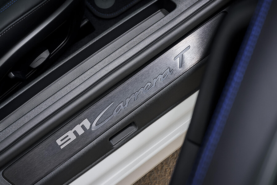 接著是一些911 Carrera T身上的小細節,包含在三角後窗上的手排檔意象貼紙、自老大哥GTS上擰下來用的擾流唇緣,還有一系列“Legends”車色選擇。喔對,Carrera T的敞篷車型也在此一併發表,軟棚共有黑、紅、藍、棕四色可選。至於車內細節?標配的Sport Chrono套件中業已包含計時套件、胡桃木排檔桿、四向電調運動座椅、專屬的內裝格紋等。座椅選配項目除了剛才提到的輕量桶椅之外,還有18向可調的運動座椅 Plus選項。當然你依然可以任意從無數的內外設計選項中進行自訂設計,不過既然保時捷已透過Sport Chrono將內外打點得有型有款,受此”少即是多”風格吸引的你勢必想要跳上車大開特開、勝過在配置頁面前沉思良久吧……