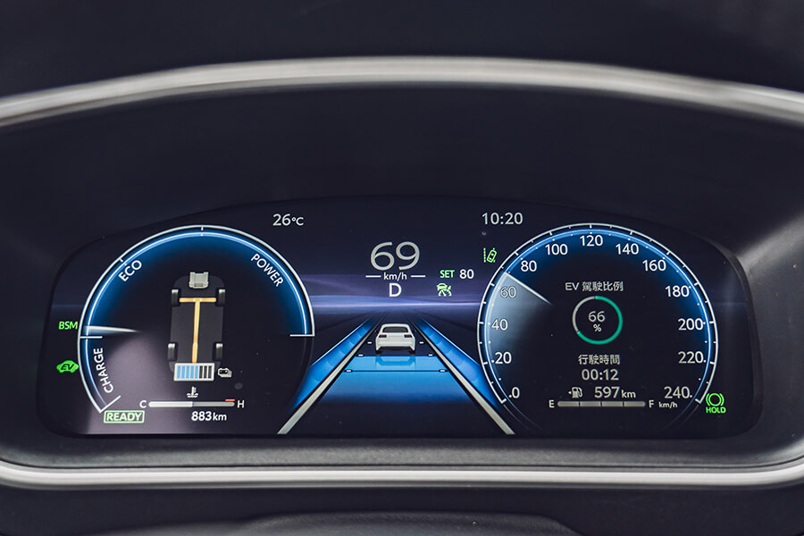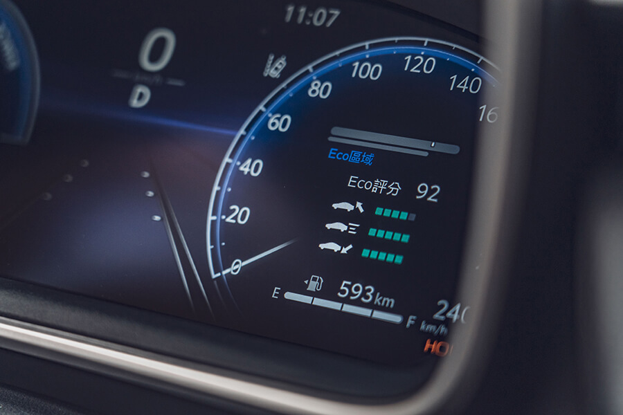 車上的第四代油電系統在內燃機啟動時幾乎無聲無響,通常要等到這顆98匹馬力的引擎在E-CVT的運籌帷幄拉高轉速時才得聞其聲。雖然加速時拉轉聲響明顯了些,不過車上的36升油箱配上油電系統讓今早出發時顯示超過600公里的續航預估、實際經過小編無情踩踏下的油耗表現亦有17-18km/l的水準。然若閣下屬力行節約派、或是自栩為環保小尖兵,新款彩色儀表的雙筒介面上亦有輸出/回充狀態、EV駕駛比例甚至是駕駛行為eco評分等。試了一下,一共分為加速、滑行與減速三階段的評比主要鼓勵駕駛平順細膩地使用踏板、並善用此車一帆風順的滑行動態提升油耗表現。想要得到好分數?右腳最好使出光頭胎在賽道雨戰的覺悟,否則當肆無忌憚一腳踩下油門後,即會重現那些你小時候不敢拿回家給媽媽看的試卷成績……。