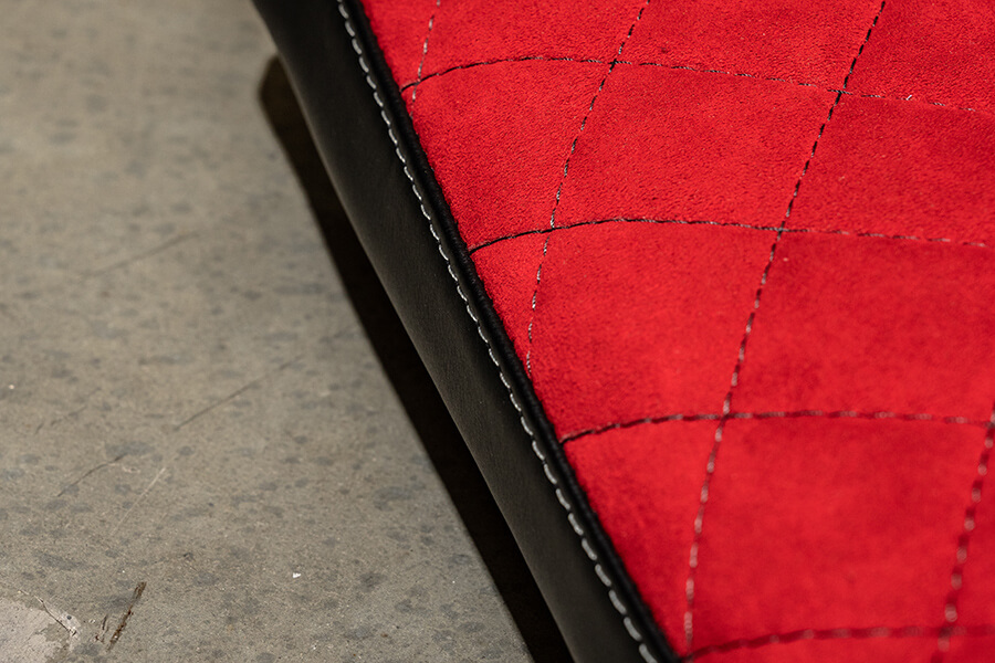 我們大可以使用任何物料包裹座鞍(粗花呢、手工鞣革,諸如此類),但最後決定採用水牛皮和很耐磨的紅色Alcantara縫線。