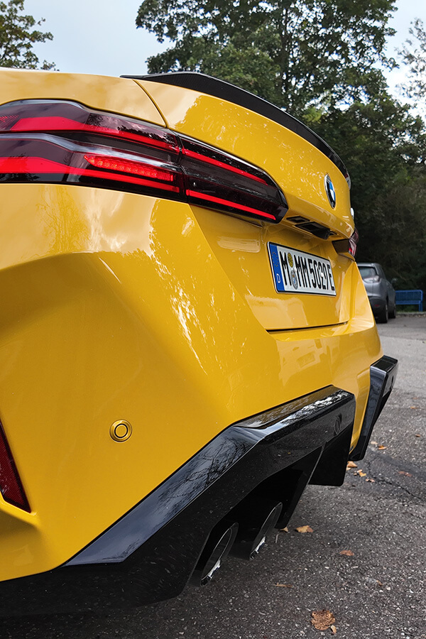 在下一個階段的G99 M5 Touring試駕之前,我想用一些篇幅來說說這次M5的造型設計。出發前的產品簡報中,M設計總監Michael Scully提到:「M5的外形概念取自賽車的Stance風格,又寬又低的霸氣模樣,讓視覺處處均充滿張力。」聽到設計師的說法再來看M5,便會覺得大有意思。由原本負責賽車造型的設計師來構思新一代M5,確實在思慮上會更加貼近車迷對於一部完美M跑車的想像,像這次M5除了臉部五官輪廓分明,負責導入冷空氣散熱與下壓力的集氣口,形狀有點像星際大戰黑武士Darth Vader面罩,車尾的寬體葉子板愈往下愈寬,重新演繹M品牌視覺美學。而M5 Touring的車尾架構更是這次改裝味最濃的設計,隨著車身輪廓微幅下切與內縮的D柱,讓尾翼順著這道弧線並在末端微微上翹,後保桿下方的大型分流器甚至比保桿還要更為突出,結合典型的四出尾管還有保桿兩側的排氣通道,讓整個視覺相當豐富又充滿力量,確實,它就是車迷心中理想M5該有的模樣。