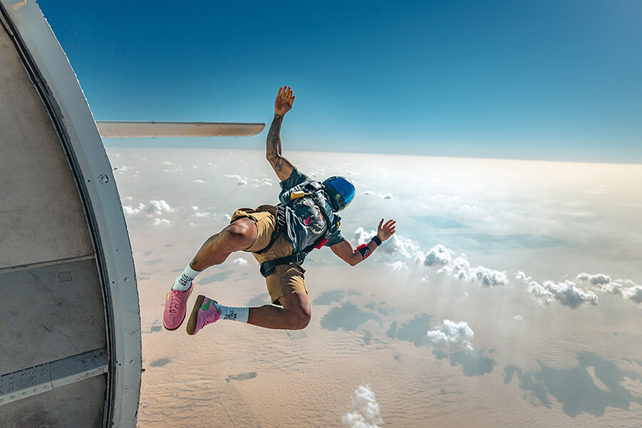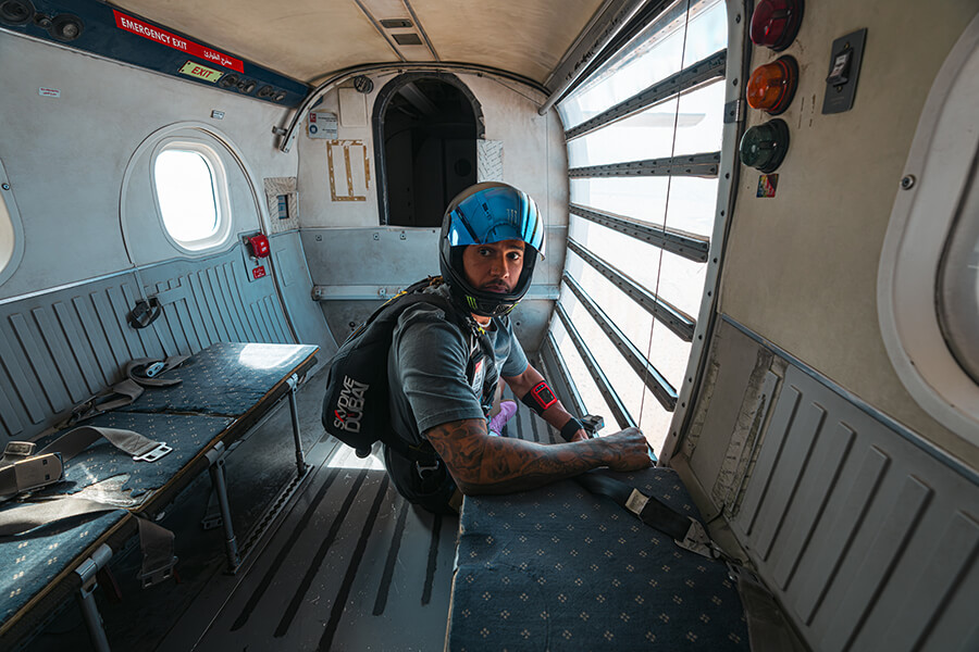漢米爾頓在機艙內顯得十分平靜,以近乎冥想的狀態默默盤算未來幾分鐘就要發生的事。「你覺得我們下一次應該嘗試哪種跳法?」他突然問我和攝影師James。我倆對高空跳傘根本一無所知,不過在我們設法拼湊出一個答案之前,漢米爾頓已經設想出解決方案,仔細編排好我們可以站在哪邊取景拍攝。「扮蜘蛛俠好嗎?我真的很喜歡這一招,因為看起來總是很有型。」他補充道:「你們可以留在艙門邊嗎?我會爬出去拉著扶手,再向後一躍,你覺得如何?」