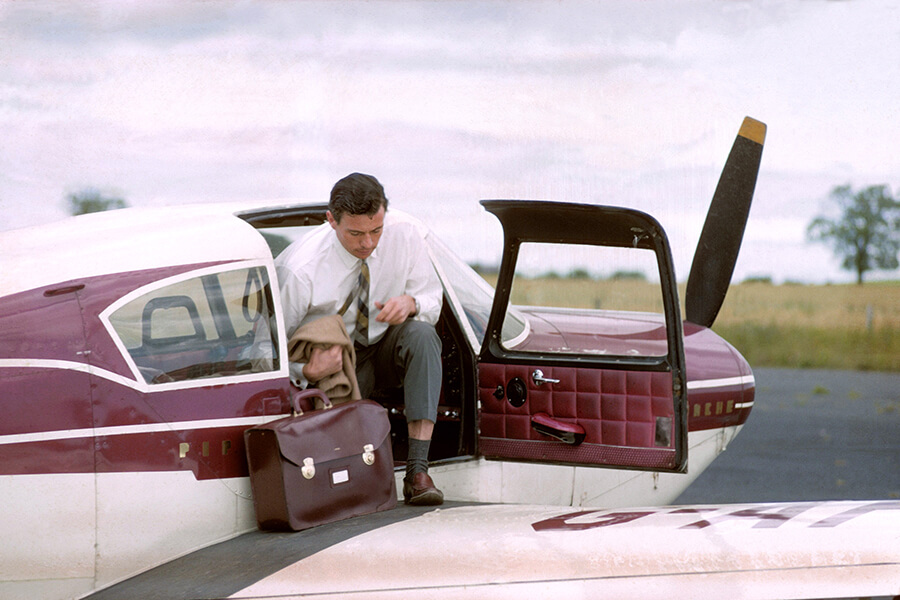 1963和65年錦標得主吉姆克拉克偏好寧靜生活,出遊時大多避免搭噴射客機。圖中可見他剛剛從老家駕駛小型飛機飛抵蘇格蘭鄧斯的私人農場。