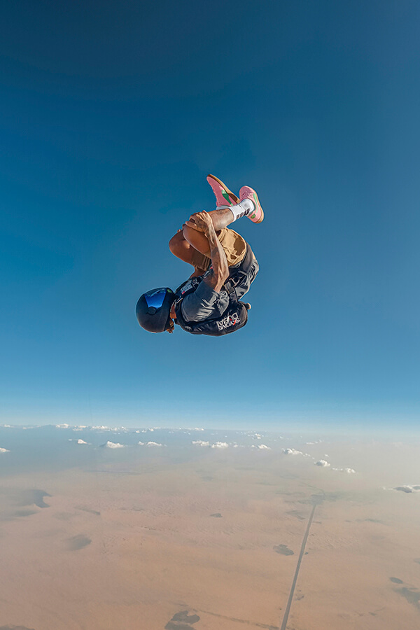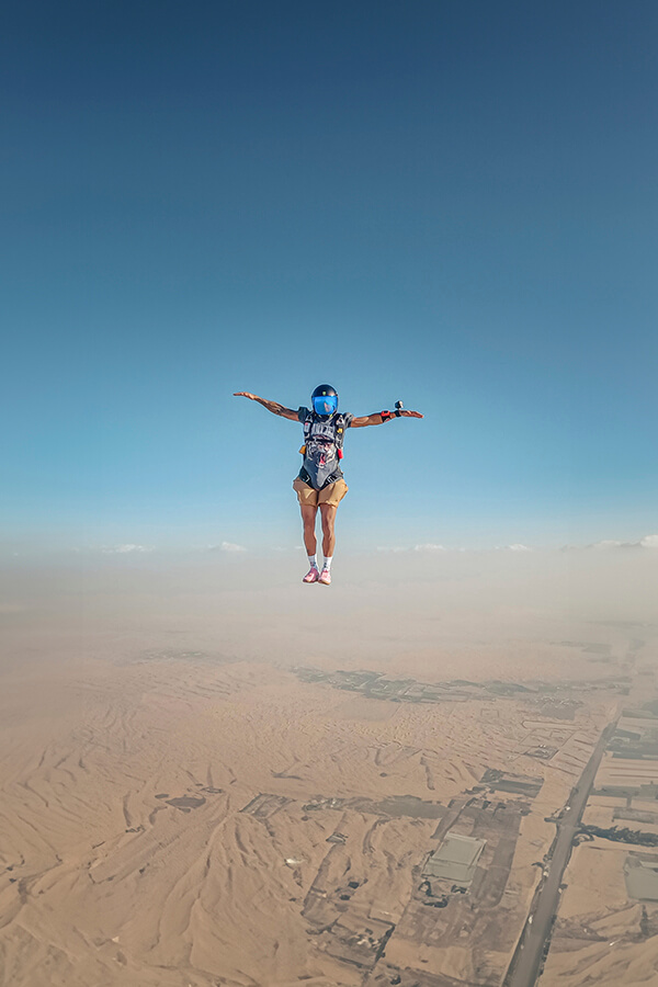 漢米爾頓這天選擇在Skydive Dubai跳傘,部分原因是這個場地位於賽季最後一站阿布達比,有近水樓台之便。這邊設有兩個跳傘區,我們所在的沙漠區是其中之一,另一個則可以俯瞰杜拜中心區的巨型人工棕櫚島。不過去棕櫚島那邊跳傘必須符合特定條件,單人跳傘的話得具備一千次左右跳傘經驗。考慮到該區有許多高樓大廈,又是人煙稠密的旅遊旺區,有此要求實在可以理解。從14,000呎高空一躍而下,體型一般的人大約五至十秒就會加速至190km/h,較諸四秒多一點便達到同一時速的現代F1賽車可謂慢似步行。不過你在自由下墜過和中可以嘗到四十五秒無間斷全速飛快的滋味,在賽道?就算是最長的SPA大直路,全力加速20秒就得煞車。「一切都有保險保障啊。」漢米爾頓笑著補充道:「我其實不會冒重大風險,但我好想過自己喜歡的生活。我是心無應許之日的虔誠信徒。」