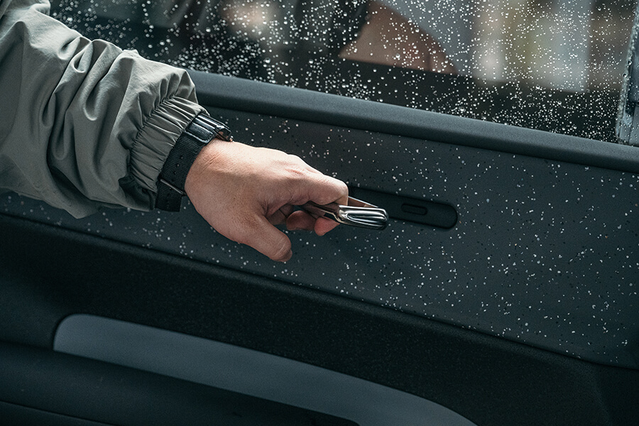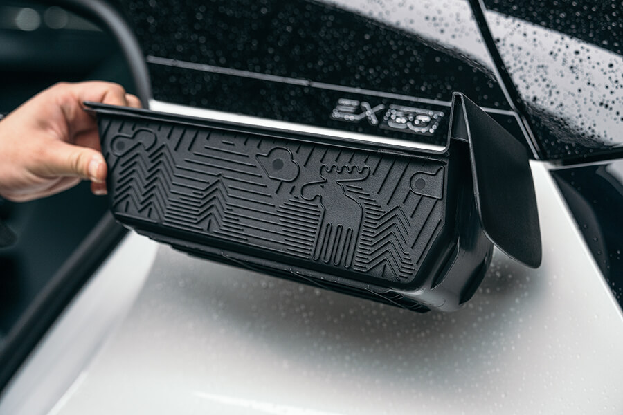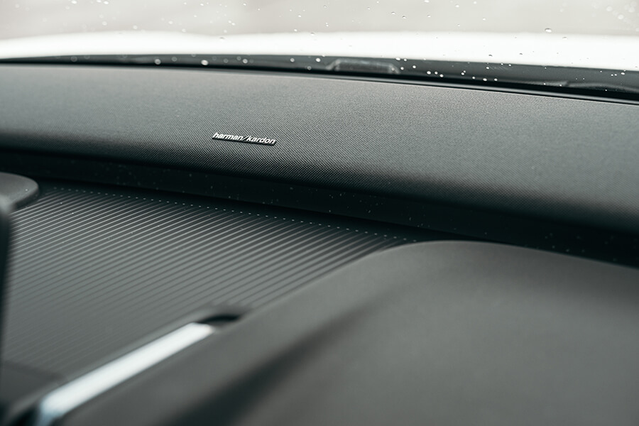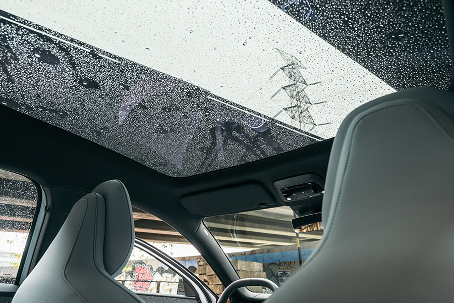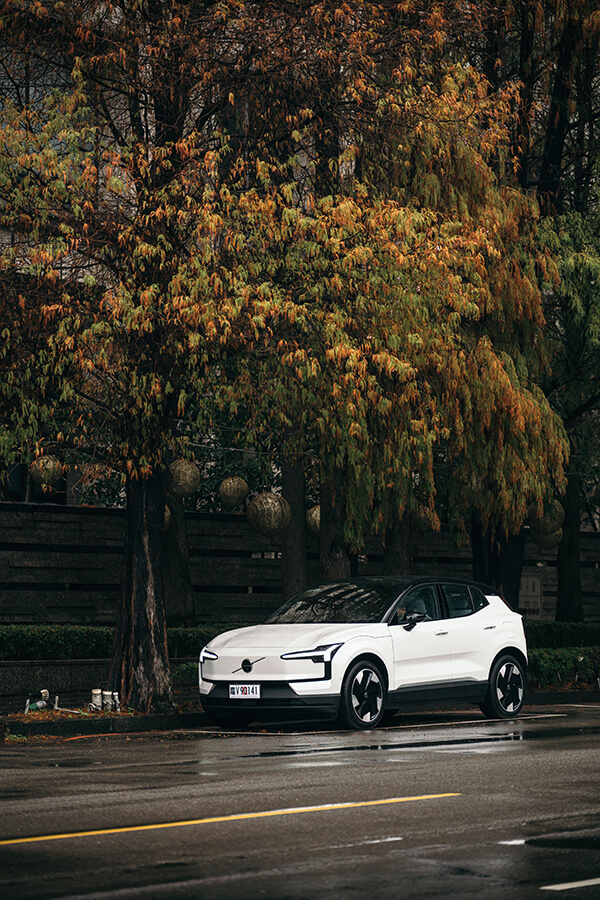 正式拿到鑰匙之前安排了場簡報,敘述EX30用了多大比例的硼鋼、新增駕駛座中央扶手側氣囊,以及在節能工程上採取髮夾繞組、有助續航里程提升3%的碳化矽逆變器,以及能從周圍空氣獲取能量、並轉換為車內熱能的熱泵技術;此外還新增了主動車道變換輔助、大車車道偏離輔助、車門開啟警示與自動停車輔助等……資訊量之多直接讓手邊筆記大爆滿、讓我擔心等等真的來得及在有限時間內一一試盡嗎……?拿到一個號稱是運動鑰匙的小黑盒子與一張黑色鑰匙卡之後試駕便開始了。一屁股坐入駕駛座,伴隨著”哇”一聲的驚呼,稍早累積的憂思立刻轉換為愉悅的心境。即便這天是下著雨的濕冷天氣,全景玻璃車頂依然將日光灑滿披著3D點陣紋路的座椅、與表面帶有星砂微粒的大片內裝飾板。上下分層的前控台上下分層,間隙中透著會依照5種以北歐自然風貌主題變換氛圍顏色的氣氛燈,同時配合音效一齊呈現。說起音效,EX30上可是有著9聲道的1,040瓦Harman Kardon音響系統呀,別看前門板上除門把之外了無一物,中央觸控螢幕後方就能看到橫亙整個車內全寬的Sound Bar,加上安裝於後車門板與行李箱的揚聲器,不僅內建等化器、還可挑選音場位置。只不過三種選項中只有駕駛座才有接受環繞音響專門伺候的特權,對於其它座位上的音樂愛好者就有點可惜啦……。