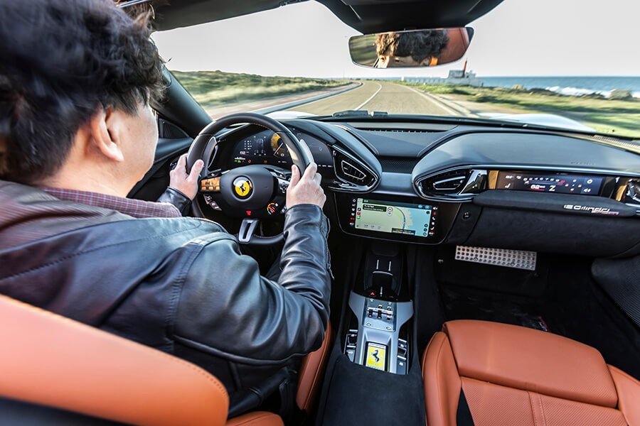 或許這次試駕的12Cilindri Spider並非我們習慣的紅色,不過那性感體態又怎能抗拒的了,光開篷架式就已經光芒萬丈,按下啟動鈕瞬間爆發的V12轟鳴,更讓我不禁讚嘆「果然V12還是要NA才對味啊!」,謝天謝地法拉利能夠堅持到這一步,不過更令我驚訝的是,上路後展現的功夫又更勝一籌了,練至9500rpm的V12引擎完全跳脫性能數據框架,讓每次踩下油門挑戰紅線區的體驗過程都興奮莫名,也不禁想起先前試過的Daytona SP3,這款衍生自LaFerrari的限量顛峰之作,以純燃油V12自然進氣引擎的絕妙反應,讓每次馳騁猶如完美風暴的沉浸式體驗,而這次12Cilindri Spider除了秉持其狂妄本色,亦蘊含GT跑車兼容並蓄的一面,讓人不得不為電控技術一日千里的飛快進程而拍手叫好。
