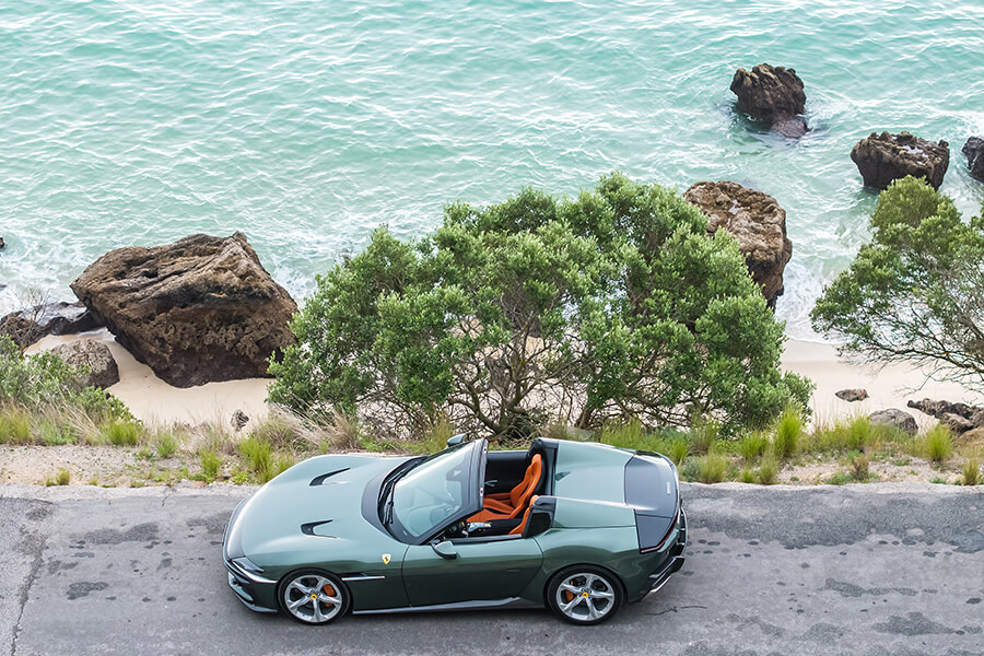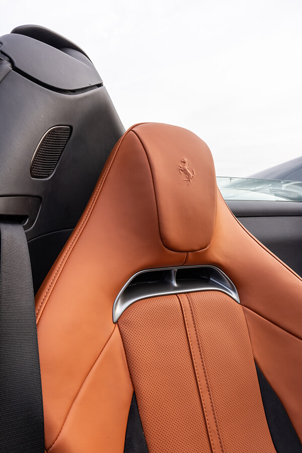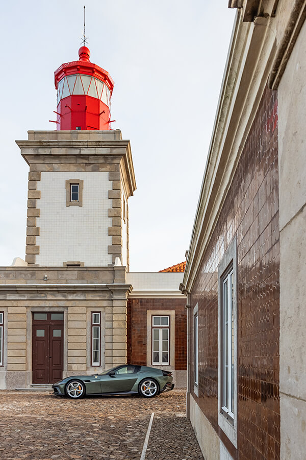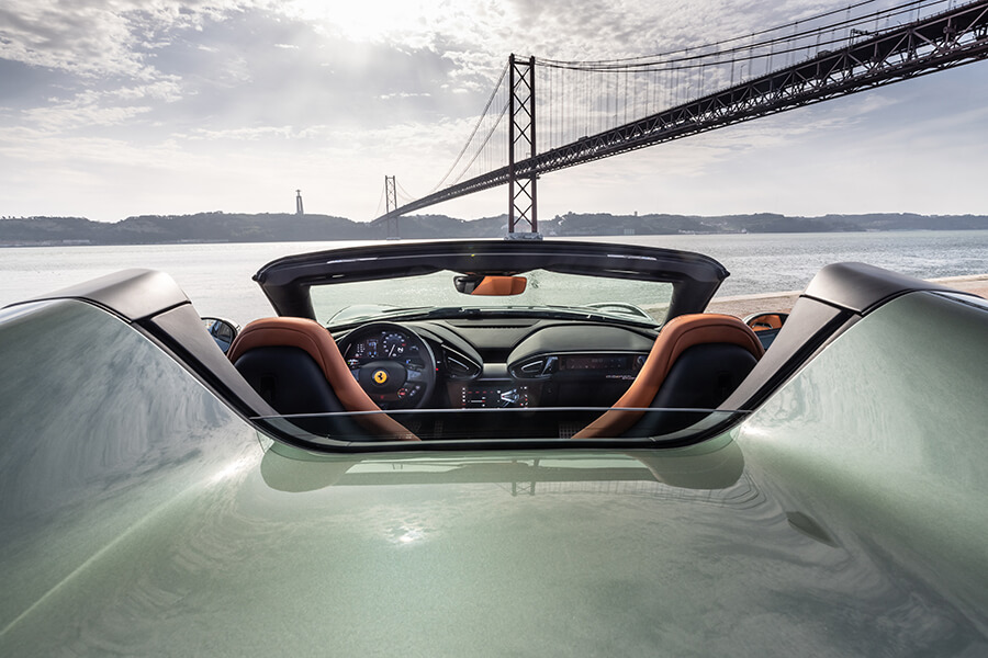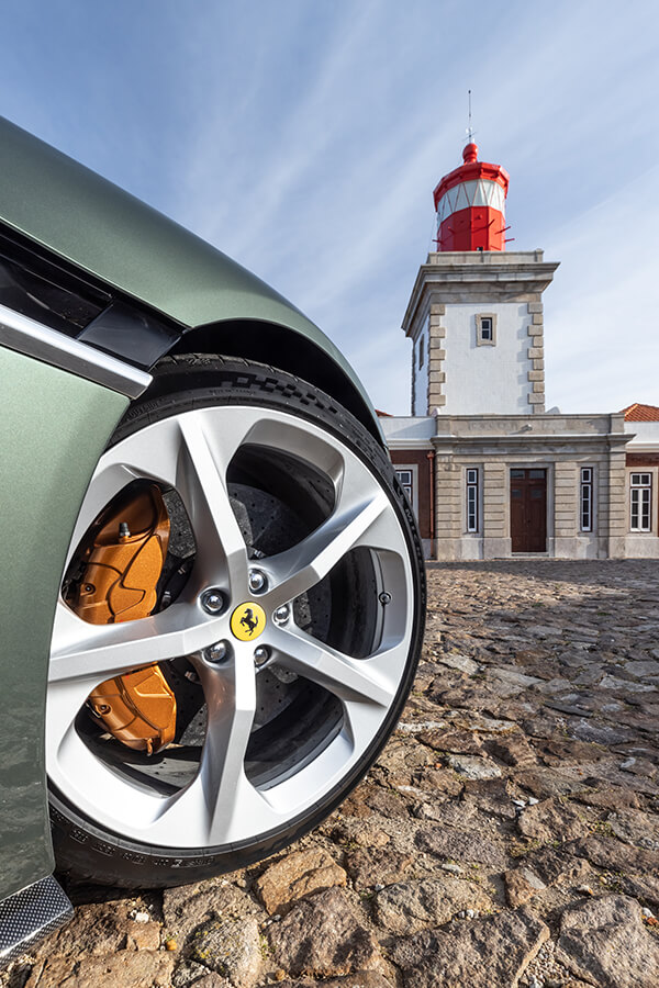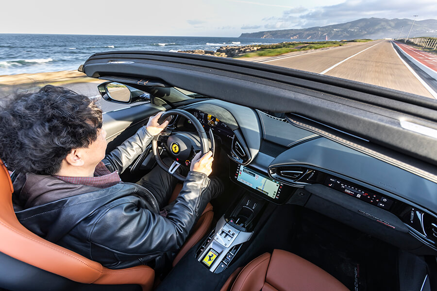 這趟試駕的路程從Cascais海岸線開始,途經歐陸最西邊的Cabo da Roca羅卡角及Carvoeira,老實說並非整段路都能為所欲為,趁塞車期間放慢步調說說剛才較少著墨的部分,這次12Cilindri Spider外型焦點除了利如剃刀的車頭,車尾的分離式主動襟翼亦相當精采,這項頗具創意的設計除了兼顧視覺美感,還能夠在不大幅增加重量並損及行李廂容積的前提下,車速60~300km/h之間可揚升10度,可額外增加50kg的下壓力(車速250km/h)。至於敞篷Spider與雙門之間看似只有活動硬頂結構所帶來的60公斤重量差異,實際上為因應敞篷架構所需而配有強化的門檻縱樑,B柱駝峰側邊亦配備特殊的氣流導引鰭片,開篷時的氣流因此而獲得梳理,讓車內乘客在車速120km/h內依然能夠輕鬆交談而不受風噪影響。