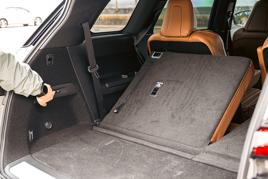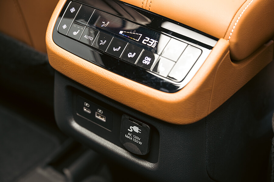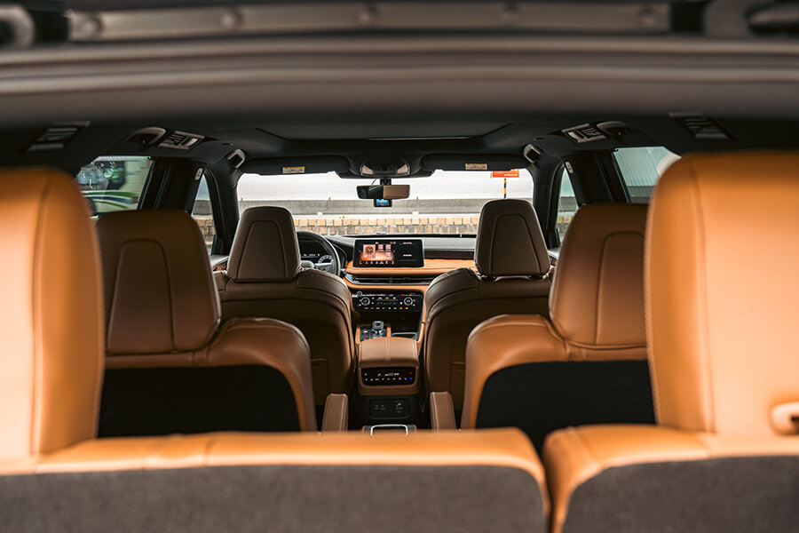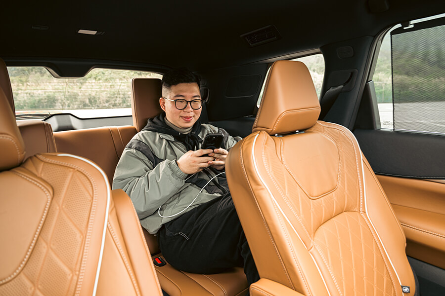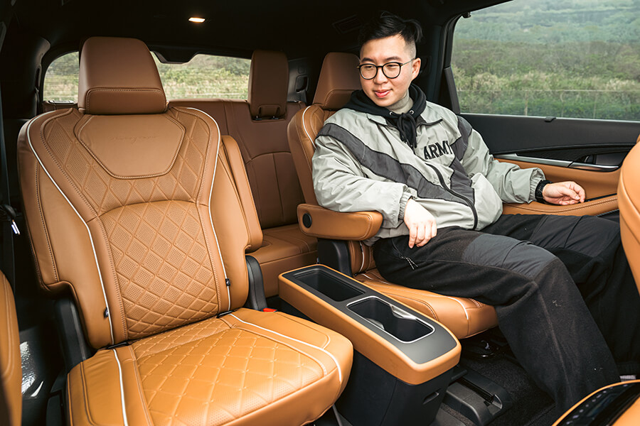 登車、關門,剛才的疑問就像是被隔絕感極佳的車艙給留在外頭。這可不能全怪我健忘,此刻車內一片由Autograph六座套件那焦糖棕色菱格紋皮革、染色開孔白蠟木飾板,與亮晶晶的16聲道Bose音響外蓋所環繞的空間,正在全景天窗外均勻地日光照耀下顯得十足可口;再回頭一看,在兩張帶有電熱功能的二排座、可調整角度,甚至無須傷筋動骨便可在行李空間電動升起的三排椅背、隨處可見的Type-C接孔與數不清的杯架之間,來往穿梭倒也不用過度費心費力。優雅地伸出一根手指,無論在車外控制還是癱坐第三排,都能讓前排如同彈射座椅一般,快速騰出可供登車的進出空間。當然,椅子上還坐著人的時候是不會彈出去的,嘿嘿,不要問我為甚麼知道……。