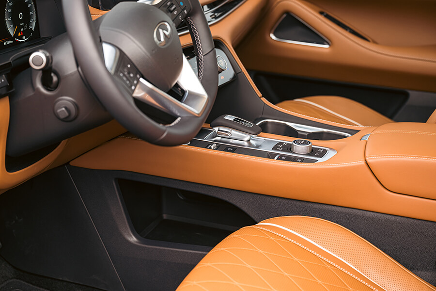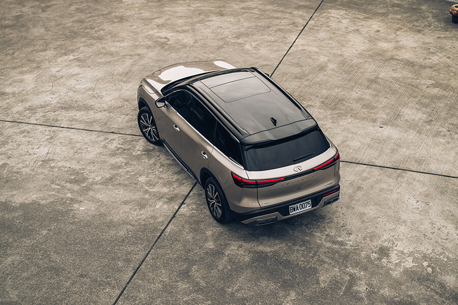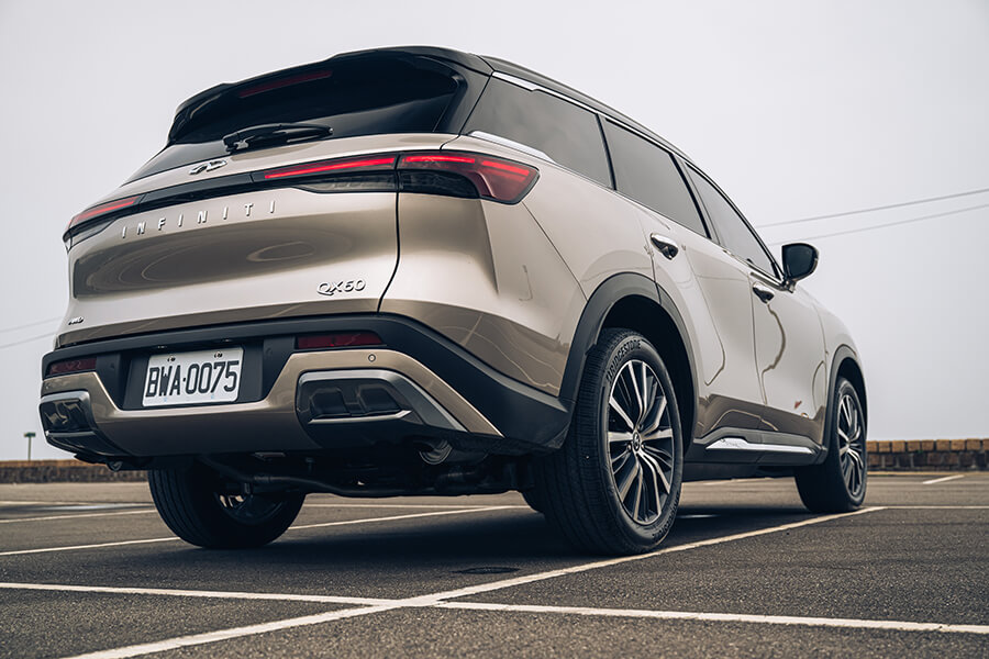 上回與QX60見面時,VQ35引擎配上充足的空間、豐富的輔助功能,使得當時與攝影Jackal兩人不過是在一個尋常的工作日裡進行試駕,都不免在QX60上充滿許多擁有此車之後各種多采多姿的生活想像。時間來到2025年的今天,眼前這部披著日冕金色、在這個低雲陰天裡依然光彩奪目的新同學,業已在引擎蓋下換上2.0升渦輪引擎,馬上隨之而來的疑問就是:這區區1,997cc的排量,當真的撐得起這輛七座休旅長破五米的龐大身軀嗎?