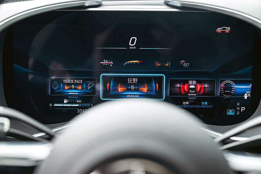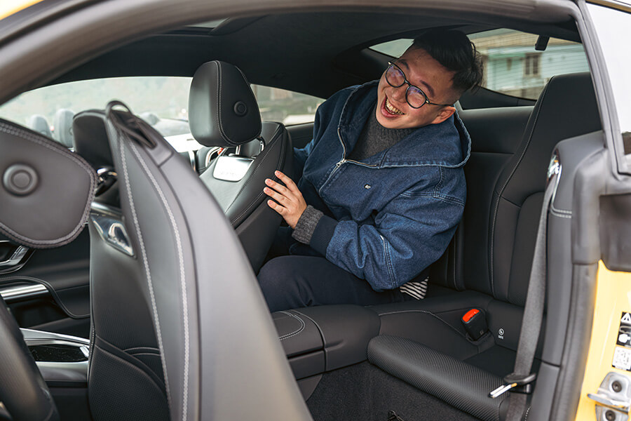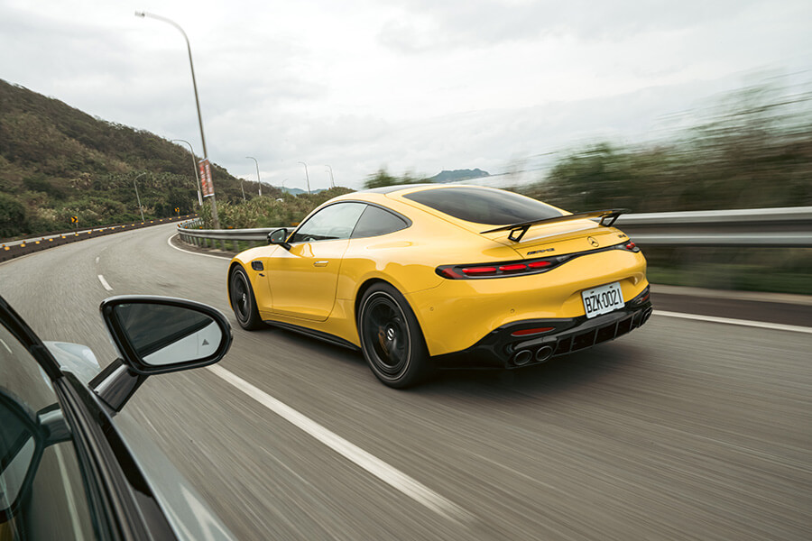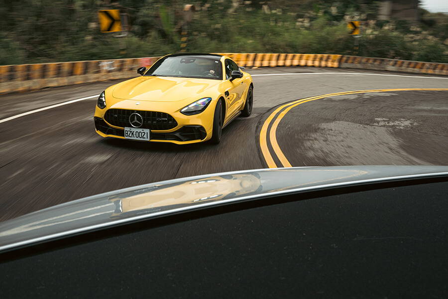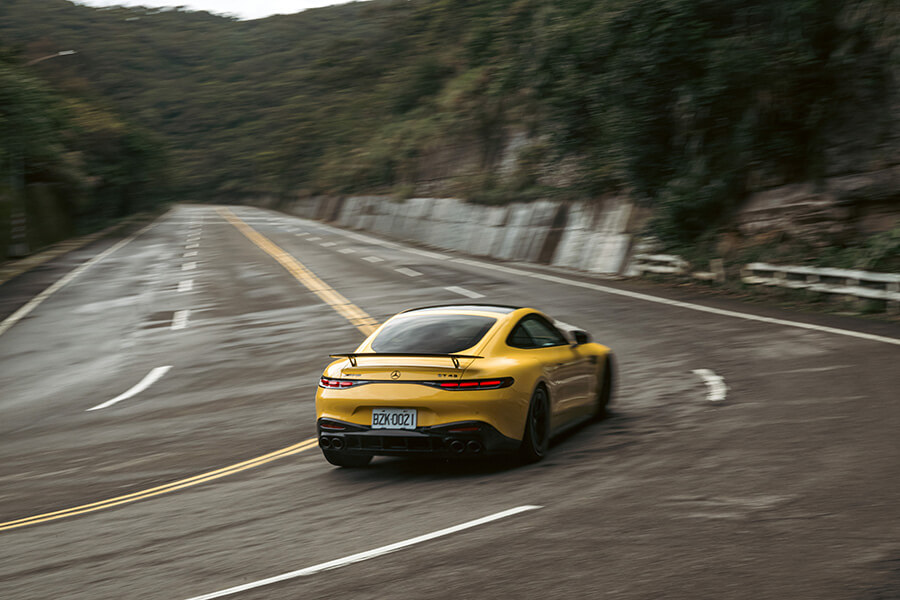 Shawn:雖然GT43車頭長度已經比前代收斂不少,偌大的引擎室裡安放著的四缸引擎,總讓穩坐後方的我感覺前軸相對身輕如燕。1.8噸並不是甚麼很輕的體重,微微擺動方向盤就能從略顯沉重的第一拍反應來體察到這點;不過若是執意往彎心一劈,鋁合金底盤便能匹配懸吊開始發揚機械抓地力。即便切至使引擎進入一觸即發狂躁狀態的Sport+模式,低寬站姿下的四百多匹馬力還是能讓你不太有後顧之憂地把油門踩到底,刻意維持高轉下依然十分”AMG”的加速曲線,在彎中刻意多下油門時……嗚呼!這車尾居然會在彎中飄來飄去,已然延遲介入時機的循跡燈號開始像是傳送摩斯密碼一般快速閃動,導回正軌的手法仍相對含蓄,沒有虎爸虎媽剪斷電腦電源線、藉此提醒你遊戲時間結束的那種生硬剝奪感。看我臉上表情就知道,這車對我來說既帶來刺激又保有掌控全局的信心。