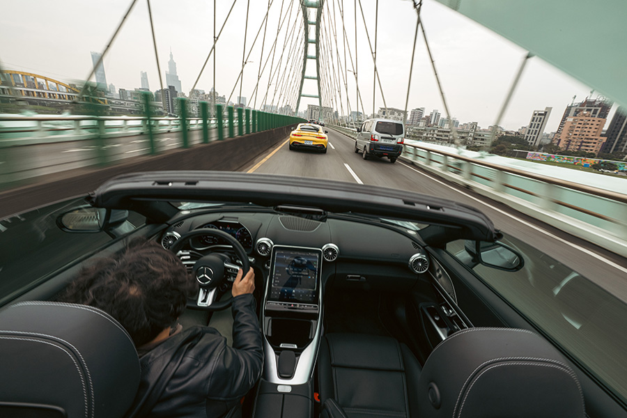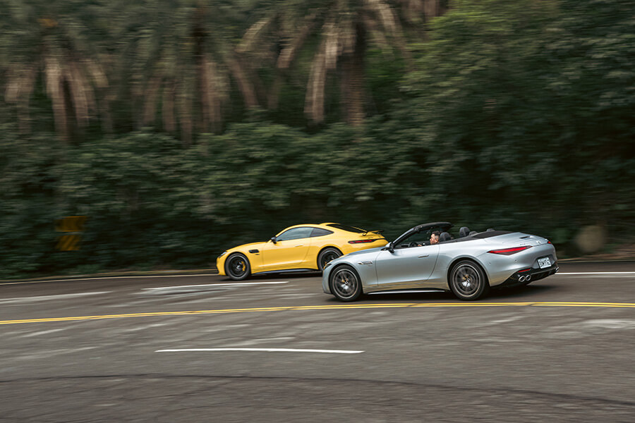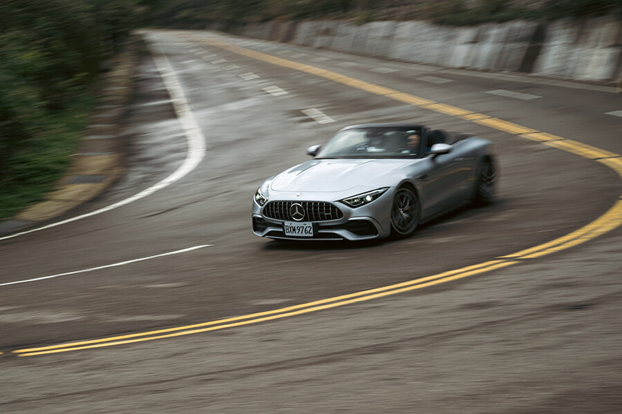 Jason:雖然SL43有較高重量負荷且動力少30匹,不過Sport Plus模式表現暢順自然,而且車上的AMG Ride Control可變阻尼懸吊表現相當甜,懂得逆來順受又線性的操控反應,即便同樣配有後輪主動轉向,但過彎動作顯得一氣呵成,在起起伏伏的連續彎路間更能發揮凌厲速度,儘管SL43開篷時更能清楚聆聽那四缸引擎不太激昂又低沉的引擎吟唱,但此時若放緩腳步,少了風噪與引擎聲侵擾的SL43反而多一分自在。