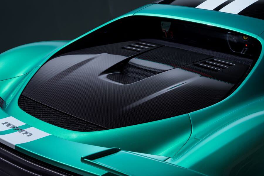 對於渦輪增壓混合動力車來說,馬力的提升基本上是無關緊要的,37匹馬力是透過不同的渦輪增壓策略而讓引擎所釋放出來的——並經過了296 Challenge統規賽車的實戰經驗,這裡頭還包含了一大堆鍛造活塞及鈦合金曲軸。夾在3.0 升V6引擎和八速雙離合自手排變速箱之間的電動馬達現在額定功率為180匹馬力,總功率為880匹馬力,比296 GTB高出50匹馬力,也就是說這款電動馬達現在可以為變速箱提供更飽滿的扭力,從而實現更快、更「感性」的換檔。