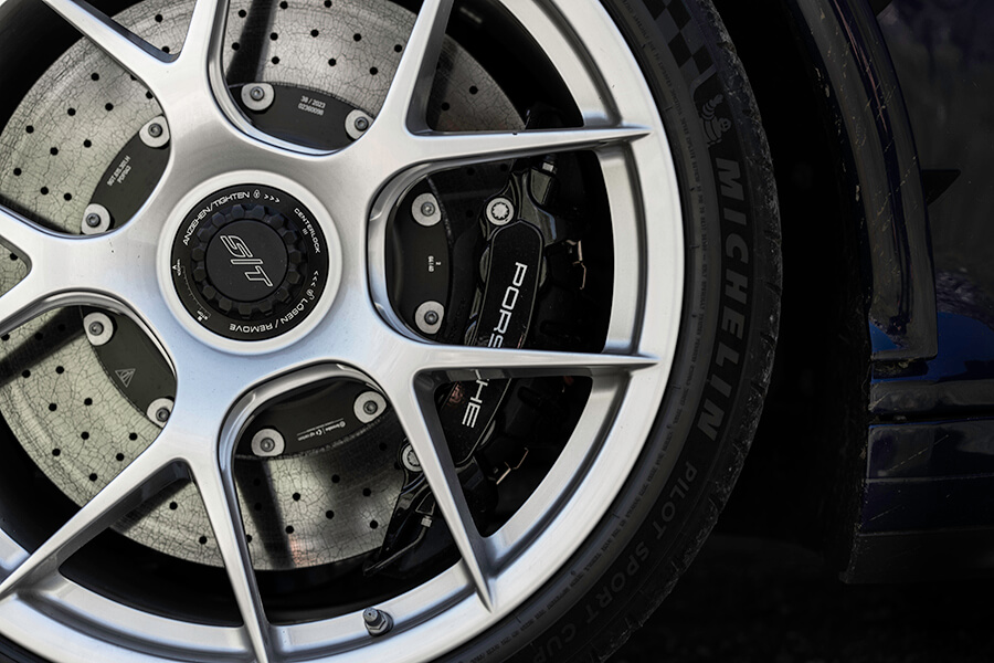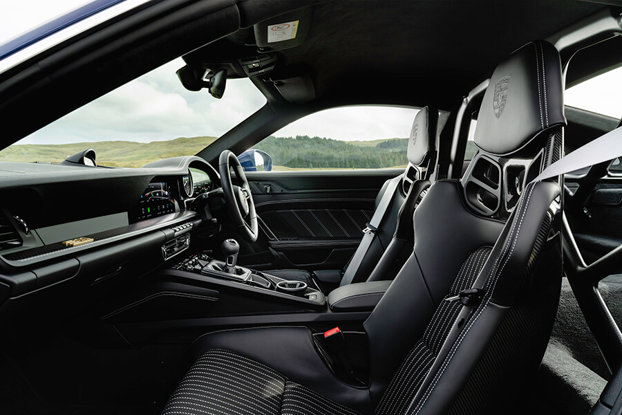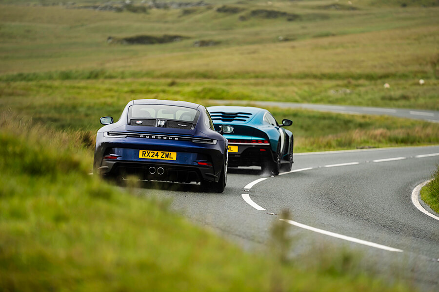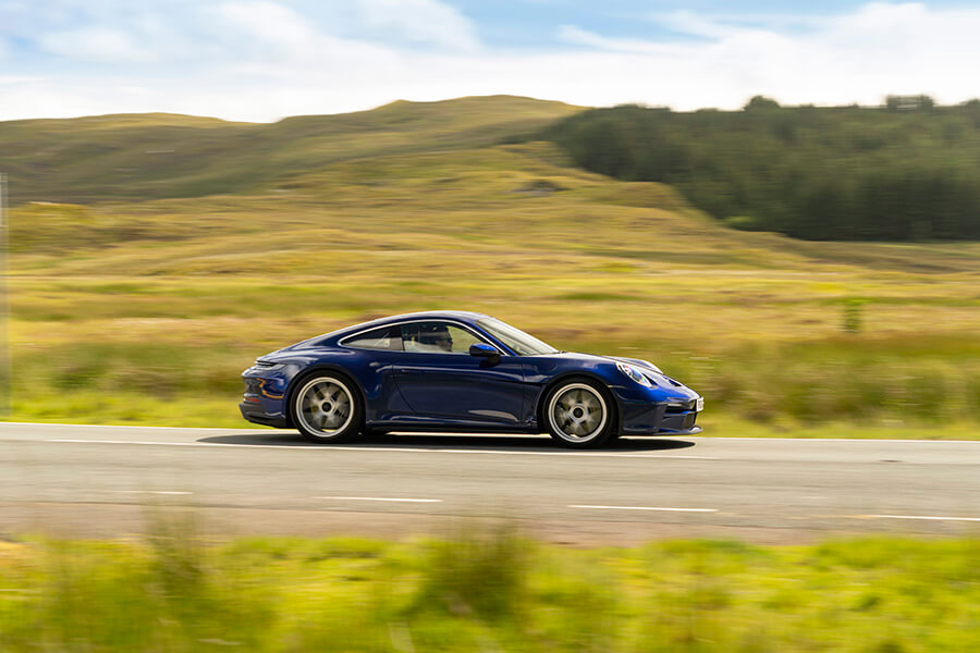 十分堅挺,我甚至懷疑自己見過比之短小精悍的排檔桿。這支桿用起來好似joystick,可以放鬆手臂光用腕力撥來撥去,Valour的木頭排檔桿卻需要運用到肩膀和背闊肌,何況終速比較短意謂你的左手會十分忙,儘管我必須指出用三檔踩到9,000rpm顯然夠你達到145km/h以上。S/T的引擎在怠轉狀態下響似搖動一袋扳手,不過中速域表現得十分暢順,一旦直搗7,000rpm以上更會引吭高歌。我最喜歡的一點也許是它只有518hp。這等馬力在S/T逐鹿的超跑江湖只屬中規中矩,卻勝在運勁吐勁無可挑剔,除了精彩刺激再無其他。輕量化飛輪對此不無幫助(就連離合器重量也只有GT3 Touring用品的一半),而且沒有花樣多多的駕駛模式(儘管車手可以調校吸震硬度),亦沒有加強排氣聲效的按鈕,說白了就是一部開箱即用的精煉911。個人以為缺乏駕駛模式和設定彈性,其實往往是工程自信的體現。