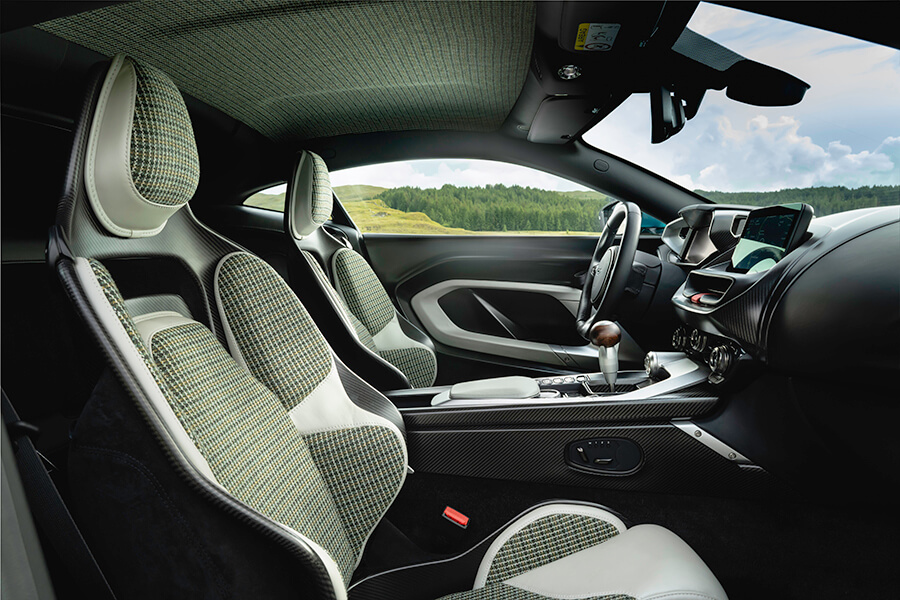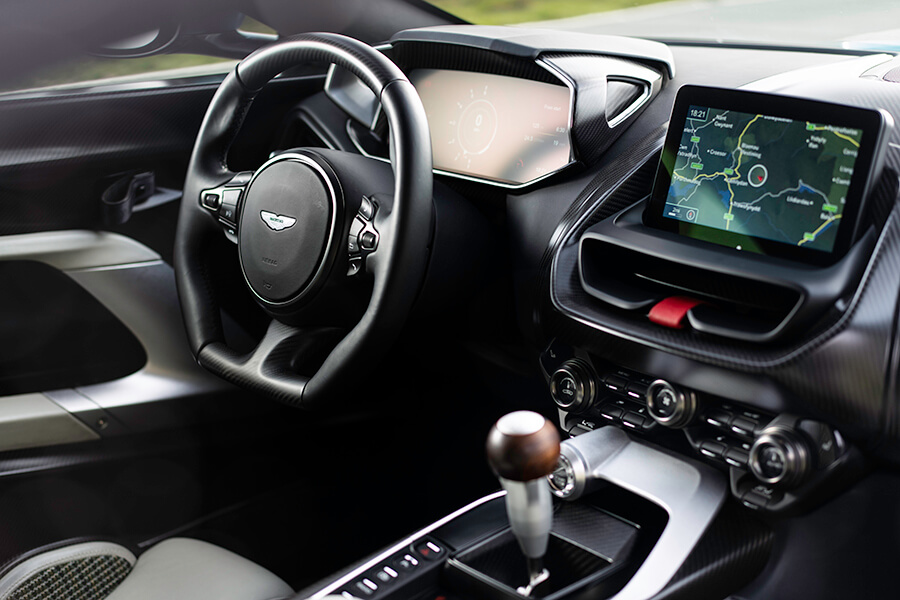 車廂設有一個相當眼熟的Vantage儀錶板,但你不會為此介意,因為你會忙於小心翼翼就座,以免下體自投羅網被碳纖維座椅上沒有軟墊的部位撞個正著。由於側窗較為淺窄,後邊又沒有玻璃窗透光(所以車廂後視鏡會充當後視鏡頭顯示幕),關上碳纖維裝潢的車門後,車廂氣氛顯得比Vantage格外陰森幽暗。