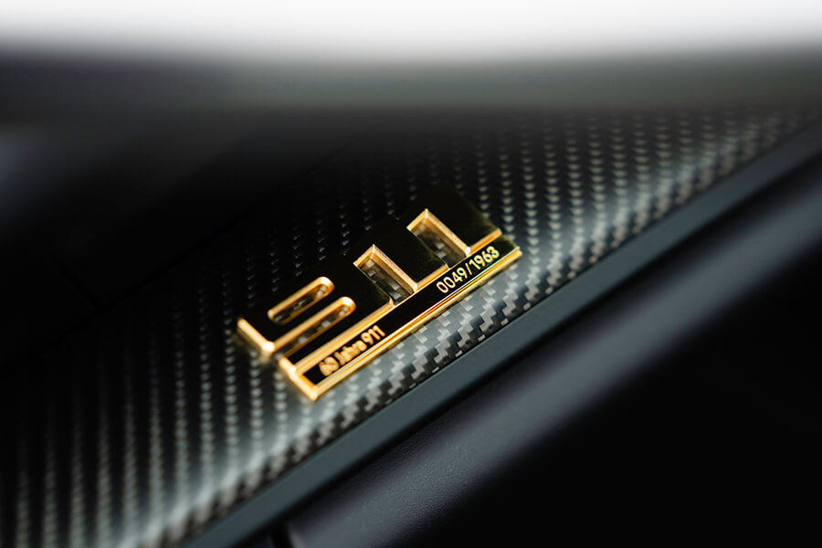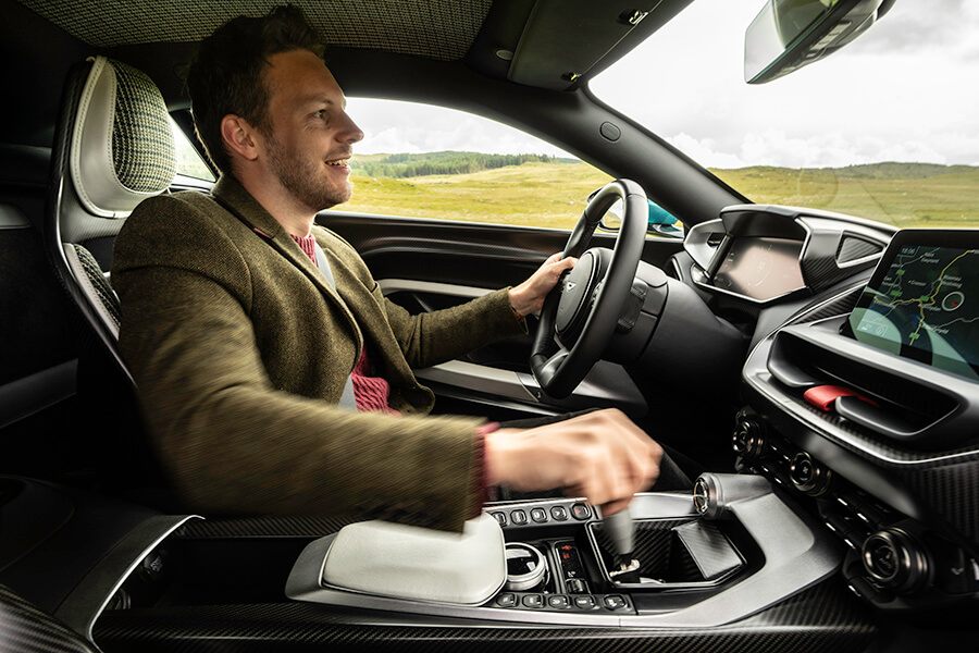 在中控台碳纖維底座上,可見屹立著一支銑削成形的金屬桿,桿頂插著一枚大似網球未有打磨拋光的桃木排檔頭,設計不可謂不誇張,但有何不可呢?排檔桿下邊的外露機關同樣古意盎然。其實設計師大可以用手工縫製鱷魚皮套遮蓋這些活動機關,不過這樣便會失去崇尚機械感的旨趣。你大可用碳纖維、鈦合金或者獨角獸眼淚淬火的真金打造方向盤換檔撥片,但換檔撥片板始終是電氣開關,電氣開關可沒法給人貨真價實的機械感。
