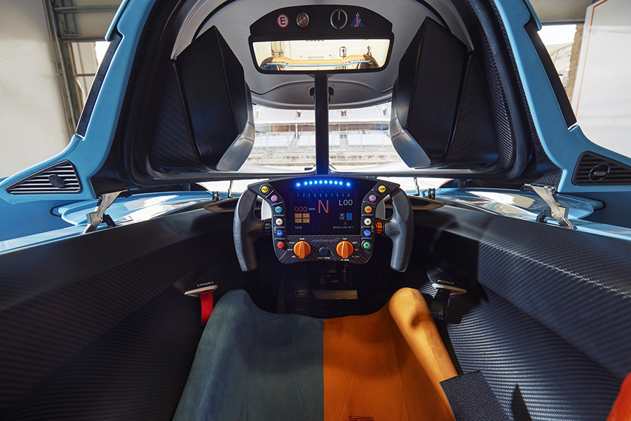 駕駛艙正前方有一個類似Halo保護桿的山字形粗壯碳纖維結構,山字中間一筆的頂端架著一個後視鏡螢幕,螢幕與弧形擋風窗之間隔著一段相當距離。當工作人員將駕駛艙蓋推回關合位置,坐鎮中路的駕駛位置和無遮無擋的擋風窗視野頓時顯得大有道理;好一番景緻呀!