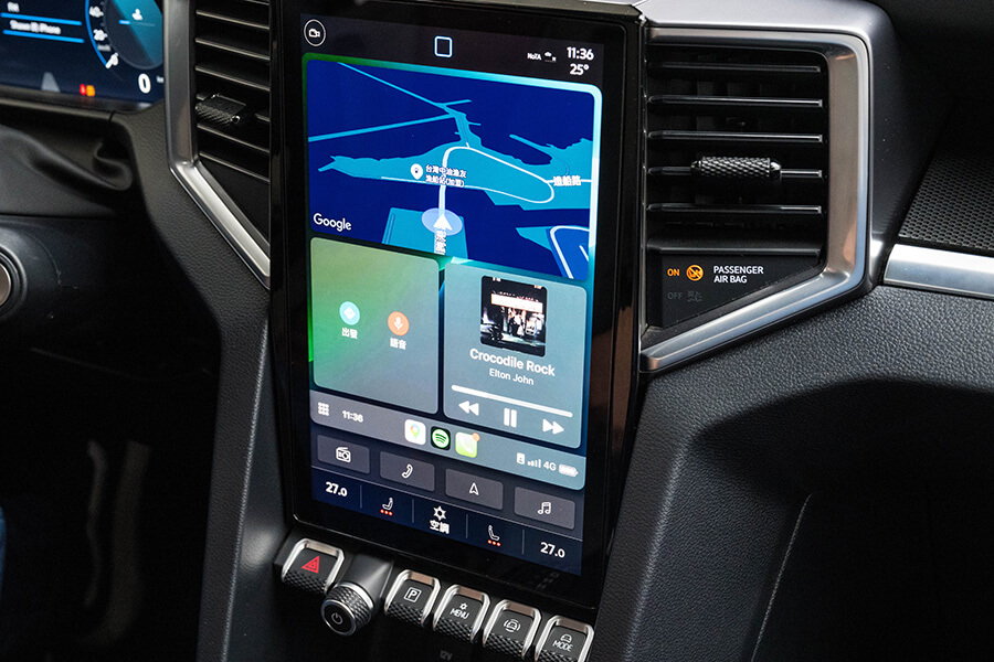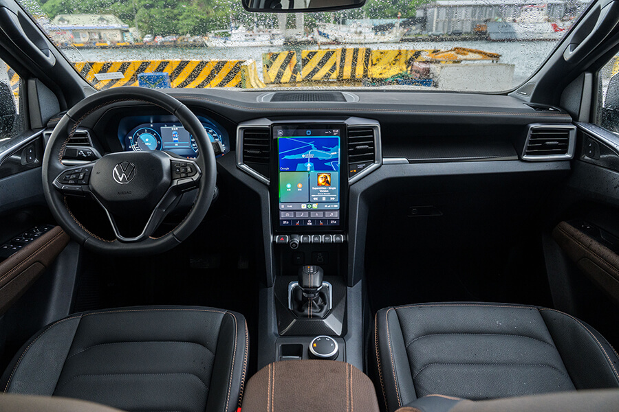 新款Amarok車裡大多以硬塑膠鋪陳車室,對於這樣一部功能性取向的汽車來說並無不妥,然而在扶手、方向盤與排檔桿等在駕駛時經常接觸到的表面,皆以柔軟的皮革材質包覆;加上12.3吋垂直排列、打開無線CarPlay時簡直像嵌入ipad的觸控螢幕,還有良好車室隔音下8具Harman Kardon環繞音響的輸出,在全地形胎加上後方葉片彈簧等設定下,除了空載狀態遭逢路面波浪免不了引發車身共振,同時輪胎的彈跳感雖有、但也不甚影響我與Jackal一路上的坐骨神經與心情,在高速巡航時保有舒服的乘坐體感。倒是未有車道置中、僅具備車道維持功能的輔助系統好似一刻不介入導正就不舒坦,憑駕駛自己雙手緊握方向盤、對準車道時,握緊方向盤的提示反倒不斷跳出、最後一口斷定肯定是駕駛疲勞,要我停車喝杯咖啡,嗯……