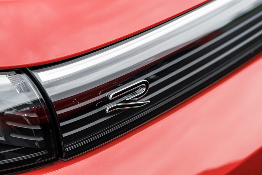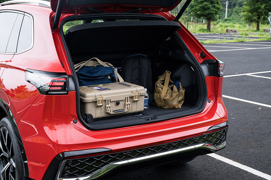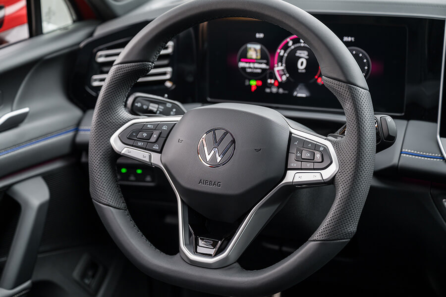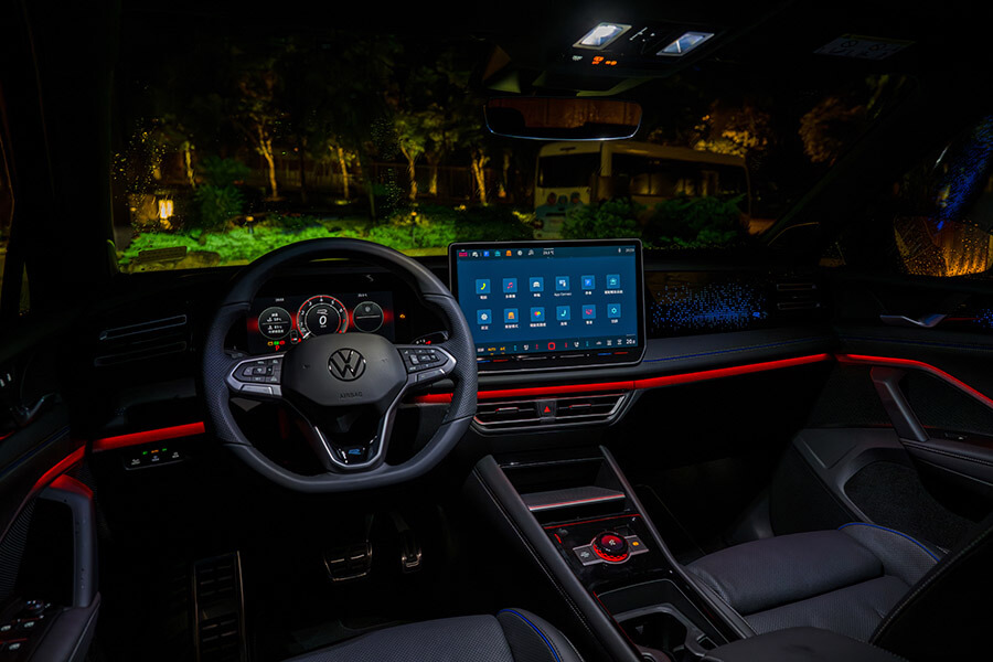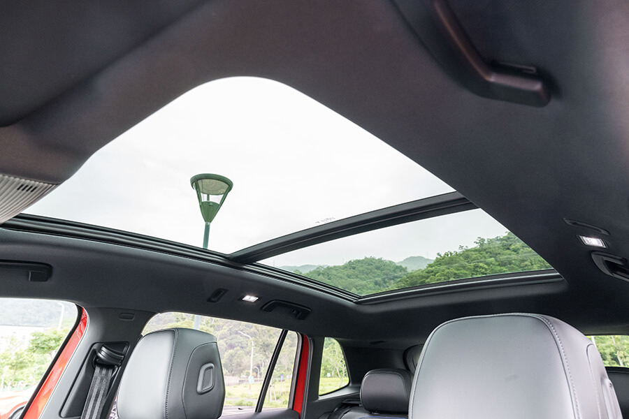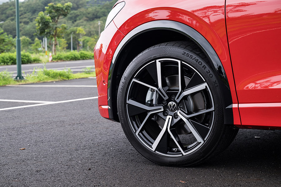 但眼前的車真的是Tiguan嗎?亮眼的橘紅車色、風阻Cd值僅0.28的流暢輪廓,加上R-Line Performance帶著一絲鍍鉻勾勒的亮黑前後保桿開孔,面積之大、造型之誇張,簡直逼迫得一旁輪拱快要無處容身;20吋Leeds輪圈上方的四座輪拱亦罕見地採用光可鑑人的黑色高光澤處理,與其說眼前正停著一部中型SUV,倒不如描述為一輛4.5米長的大鋼砲倒還更貼切。
