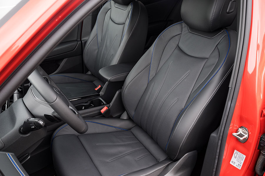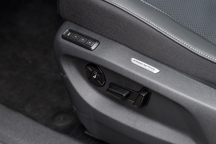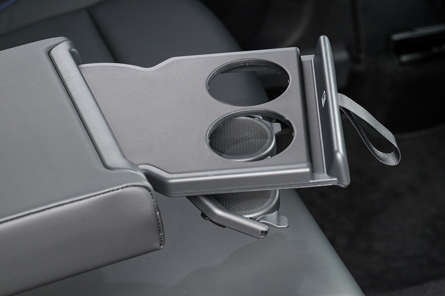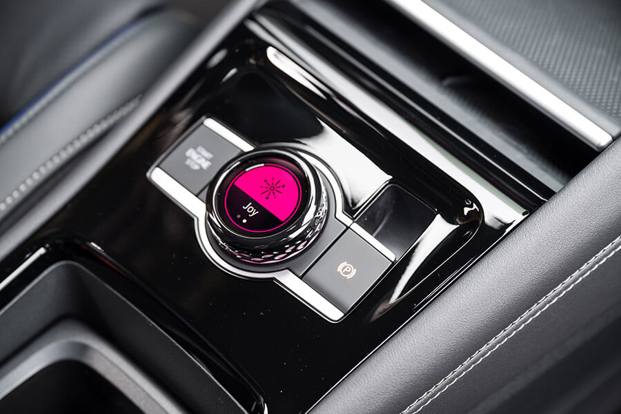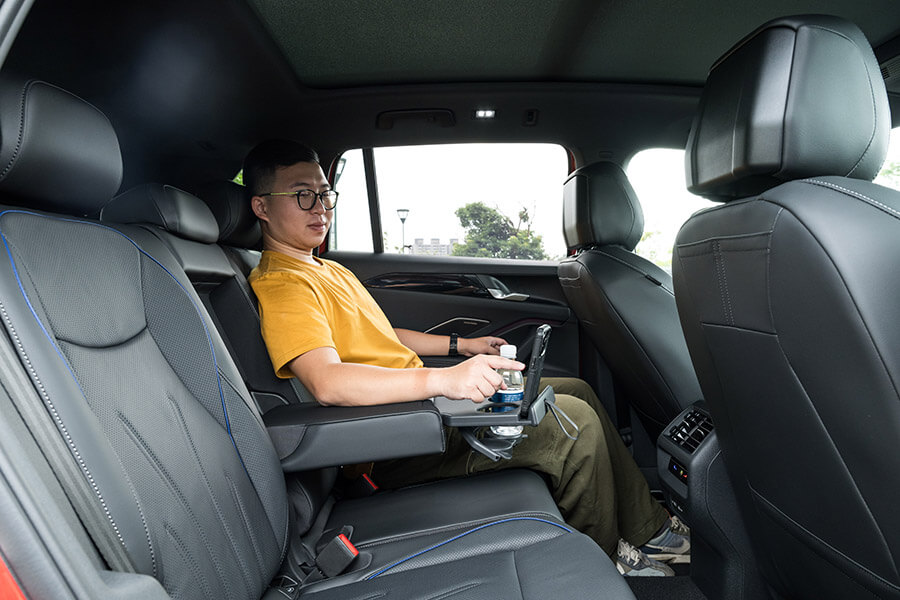 副手座前方與兩側亮黑飾板上密似繁星的點綴燈光也不僅只是裝飾用,更能在進出車輛時隨著上鎖/解鎖以及模式的切換一同閃動、變色,實際的發光效果亦如隨著光線反射的金蔥粉、又像隨著音樂閃動的聲紋般一明一滅,相當有層次與質感吶。檔位操作跟隨許多車型來到了方向機柱右側以旋鈕方式操作,兩張前座椅中央發著光的鏤空圓柱體則是中央控制旋鈕,作用與不久前試過的Superb類似,旋轉能切換音量大小與各模式選項,在上頭的小螢幕點按與滑動就能在音量、駕駛模式與車室氛圍間切換欲調整的項目。隨著駕駛模式的不同,儀表、氣氛燈的顏色、明暗,乃至於音量大小與音場設定都會隨之改變。雖然我分不清”愉悅”與”動感”哪個模式音響比較大聲、燈光比較亮,但好在駕駛模式是獨立調整的,同時也保有可自定義的個人模式,切換模式不用像是中文大會考,絞盡腦汁只為臆測哪種選項更帶勁。除此之外,雙前座AGR認證、具備加熱/通風功能且集電動腰靠、多模式氣動按摩於一身的Varenna真皮座椅、還有後座扶手處藏有手機平板架的杯架裝置等配備與巧思,再加上全景天窗與Harman Kardon音響的氣氛營造,不論坐在哪張椅子上的感想都何止舒適二字,甚至讓人覺得十分得寵吶。