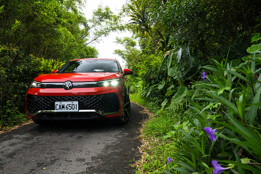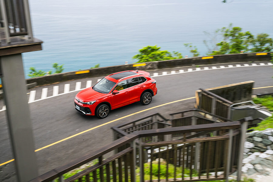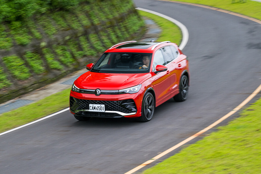 即便就是一部中型SUV,這一身R-Line Performance限定的配色、車身套件與貼得到處都是的R logo還是激起我對此車操控的好奇心,話不多說就是切換運動模式、方向直指山路準備試招。這輛Tiguan在尋常狀態下的轉向反應本就顯得較為紮實精準,在Sport模式下反而感覺不出太大差異,倒是油門反應顯著提升、高轉飽滿的動力更加凸顯。收油後變速箱亦頻頻退檔,積極將引擎維持在高轉地帶;入彎過程在車輛動態管理系統(VDM)策動4Motion四驅步法顯得爐火純青,轉向服從性十分高;配上在運動模式下倒依然是略偏舒適的調性,有種下盤反應迅速、重心略高的車身則稍遲半拍跟進的感覺。不過一旦拐入彎中,四驅步法確實能快速穩住陣腳,且外側懸吊在彎中一度遭逢坑洞的反應倒十分乾脆,一收縮、一復位的動作完全沒有過多的回彈與搖晃、持續穩住車身動態的表現令我印象深刻。