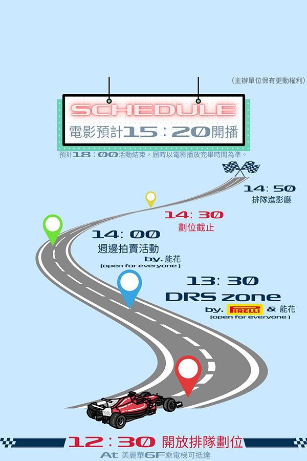 在臉書社團「F1台灣粉絲團聊天室」裡,平時其實就不時舉辦F1賽事的包場活動,這次則是由成員「能花」號召起今天這次包場。一個IMAX影廳、加上整廳都是F1車迷的滿場觀眾,當然不是吞吞爆米花、看看電影就此完事這麼簡單。在自發性地組織起工作團隊並多方接洽下,一場經過精心籌備地車迷聚會就此誕生……。