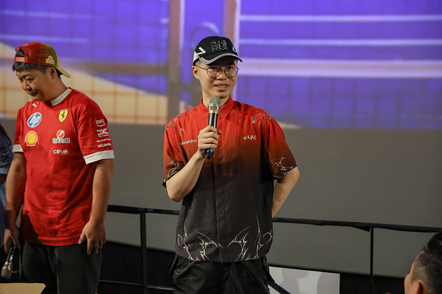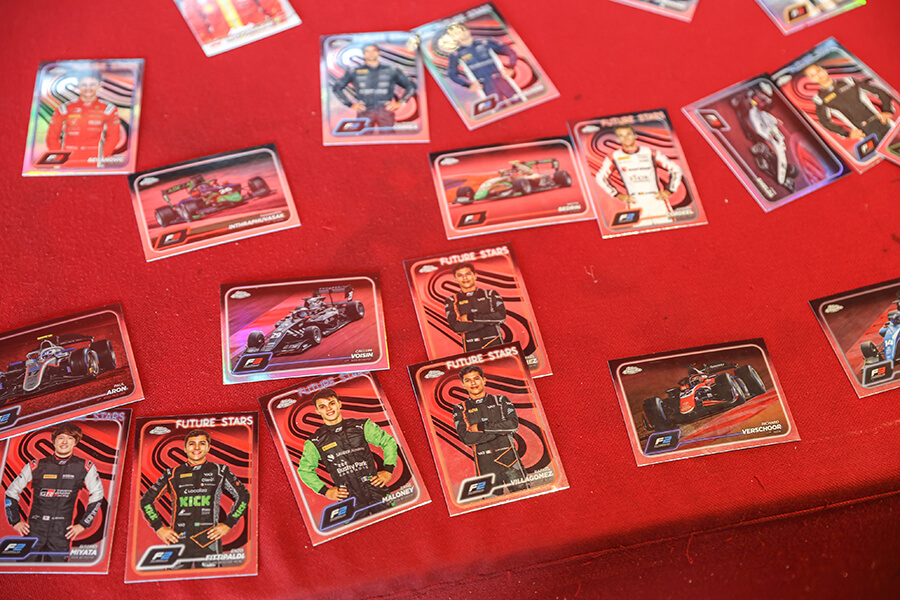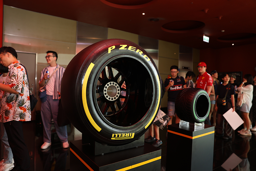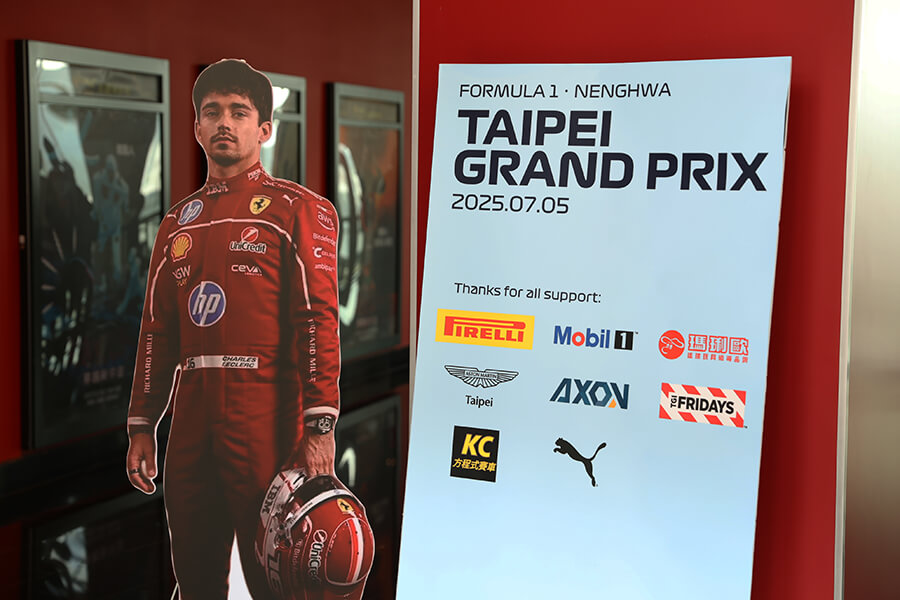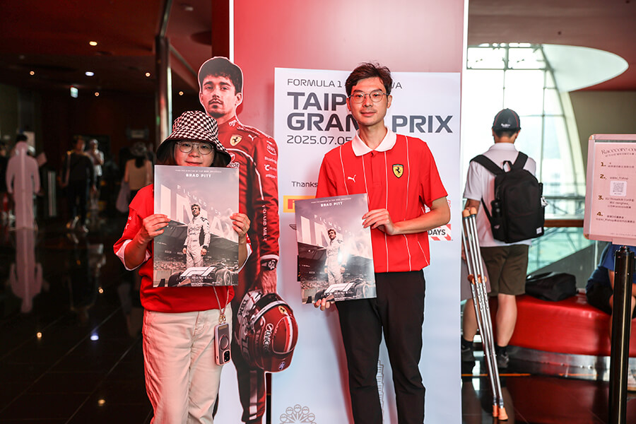 才剛乘著電梯登上報到現場,一顆F1輪胎就這樣簡單粗暴地矗立在前,一旁桌上擺著有成員自行手繪的Brad Pitt電影海報與車手小卡與迷因小物(?),一群工作人員穿著賽道工作人員背心、井然有序地分工合作引導劃位、領票,旁邊還有幾位車手在F1英國站緊湊地賽程間抽身來到現場(好吧,其實是人形背板)與大家合照的F1車手。