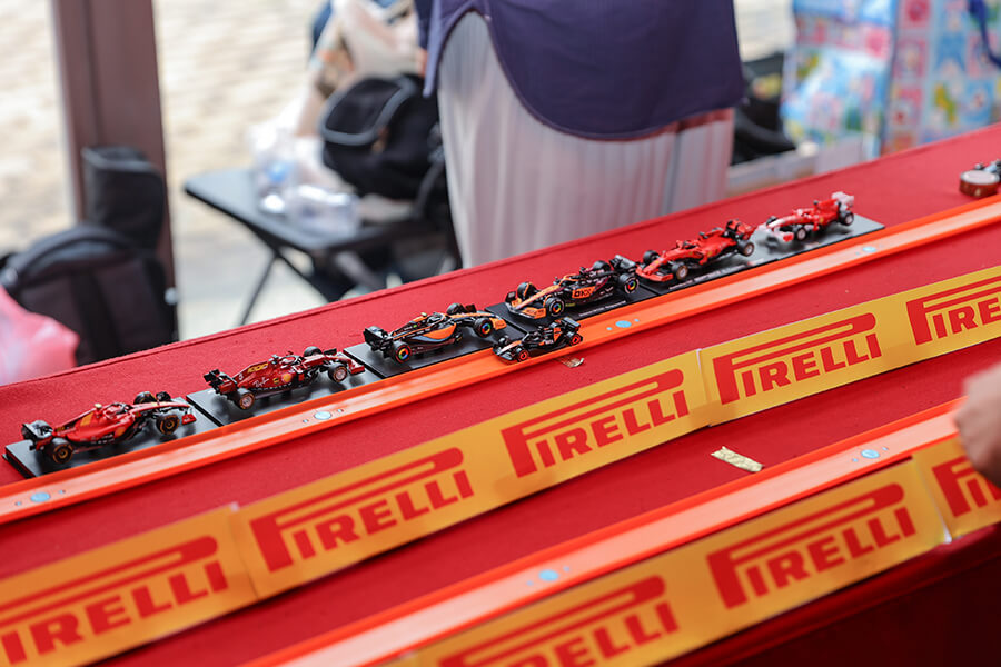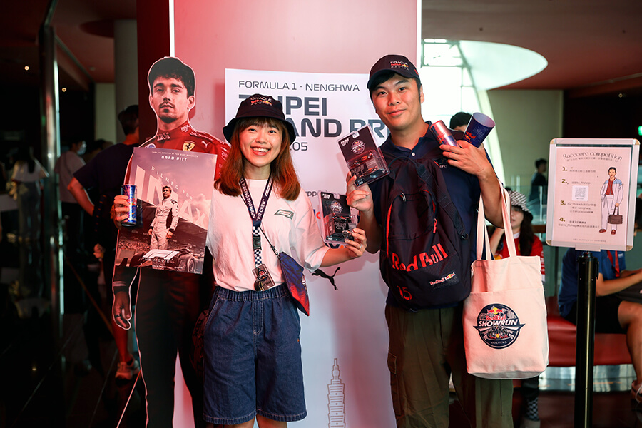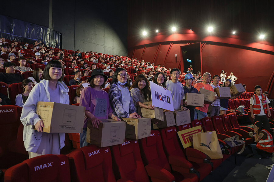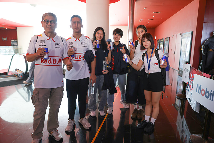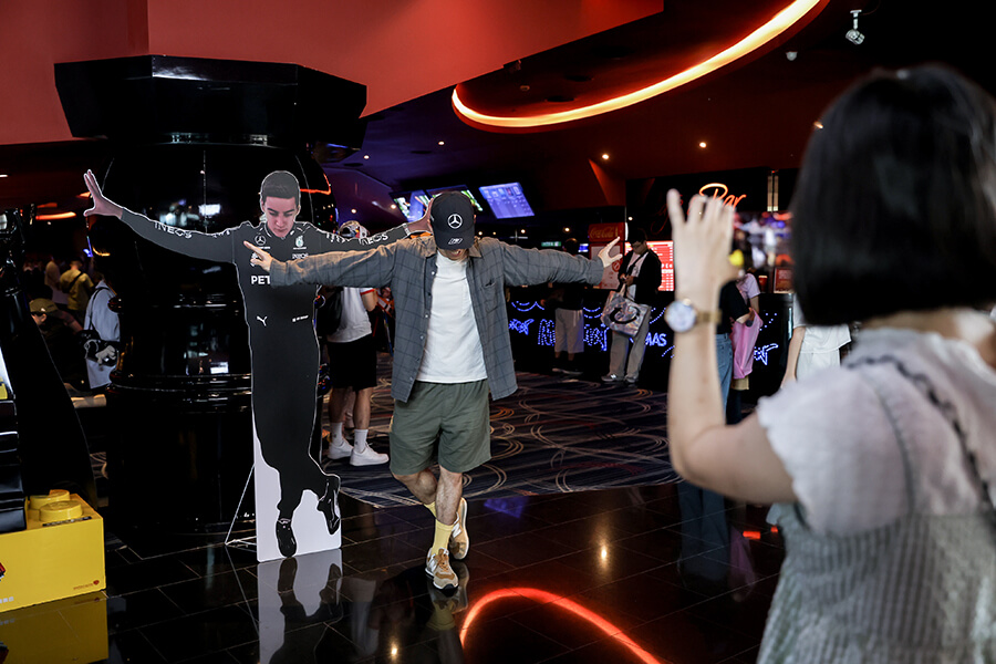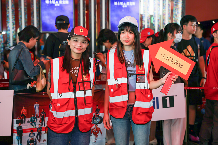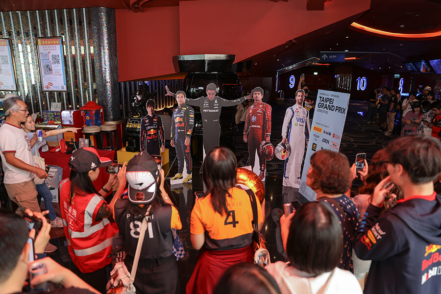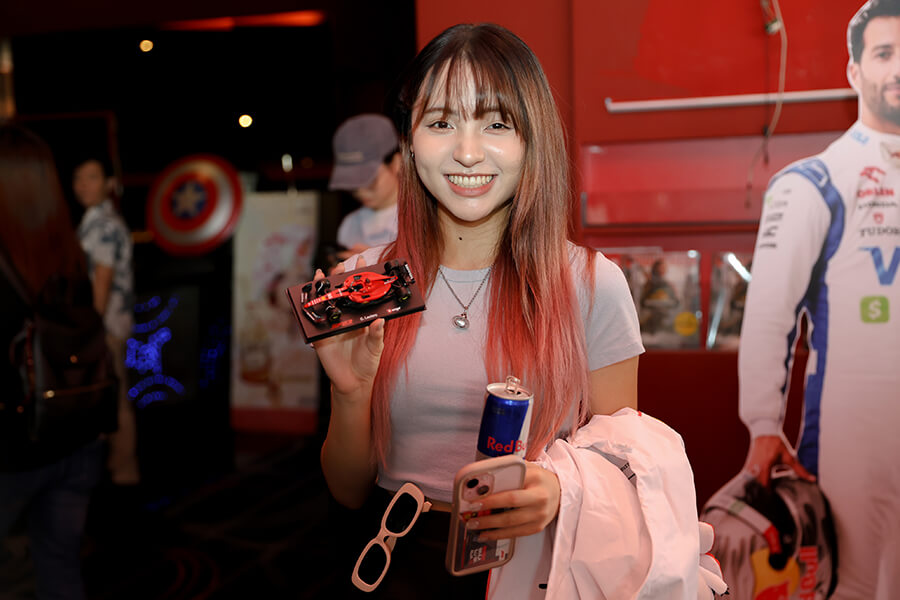 穿著賽車風裝扮在現場拍照打卡其實也是現場活動的一環,由同樣身為F1鐵粉的模特兒”王心恬”擔任主審,裝扮最特別用心的三位除了能獲得滿到爆棚的虛榮心、還能獲得”KC方程式賽車”提供的優勝獎品。如果閣下雙手操駕的細膩程度遠高於穿衣品味,亦可在一旁的趣味遊戲攤位推動小小F1模型車瞄準一桌的精美獎品而去,想帶禮物回家?挺簡單,將模型車推到賽道邊緣的記號處就可以,但實際試過之後似乎真的不是那麼容易吶……。隨著入場時間接近,從活動地點移往影廳的過程精彩地像是一場遊行,路人看到這一大群奇裝異服的隊伍紛紛好奇發問表示這是甚麼VIP場次,語畢,一位工作人員扛著一顆連圈帶胎的F1輪胎穿過眼前,看得眾人瞠目結舌又啞口無言。