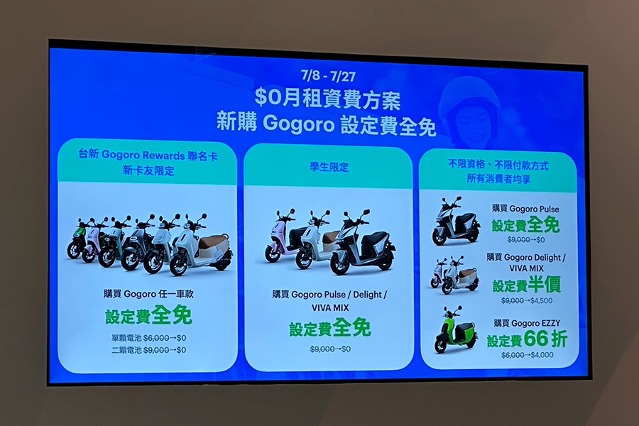 - Gogoro 熱銷車款優惠:即日起至 7/27,購入 Gogoro Pulse 享設定費全免、Gogoro Delight 或 Gogoro VIVA MIX 享設定費半價、Gogoro EZZY 享設定費折 $2,000 元。